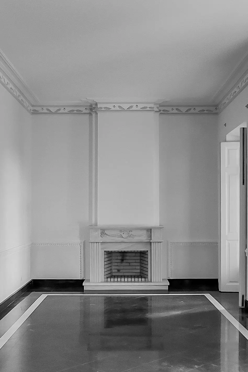 Wnętrza zostały utrzymane w bardzo jasnych, odbijających światło, kolorach, które poprzez grę cieni podkreśliły kształt dekoracyjnych ram ściennych i sufitowych, wpasowując się w ideę reinterpretacji atmosfery starej willi. Na parterze, aby rozjaśnić przestrzeń, zdecydowaliśmy się na wprowadzenie jednolitego wykończenia w jasnoszarym mikrocemencie. Na pierwszym piętrze, aby stworzyć bardziej komfortową i przytulną atmosferę, istniejący kamień pokryty został tradycyjną drewnianą podłogą we wzór Herringbone.