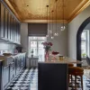 Pomogły w tym naturalne, tradycyjne materiały – drewno w pięknym ciemnym wybarwieniu i kamień, który ułożono m.in. na podłodze w kuchni w charakterystyczną szachownicę. Całość domykają gipsowe sztukaterie, które niczym koronki oplatają przestrzeń.