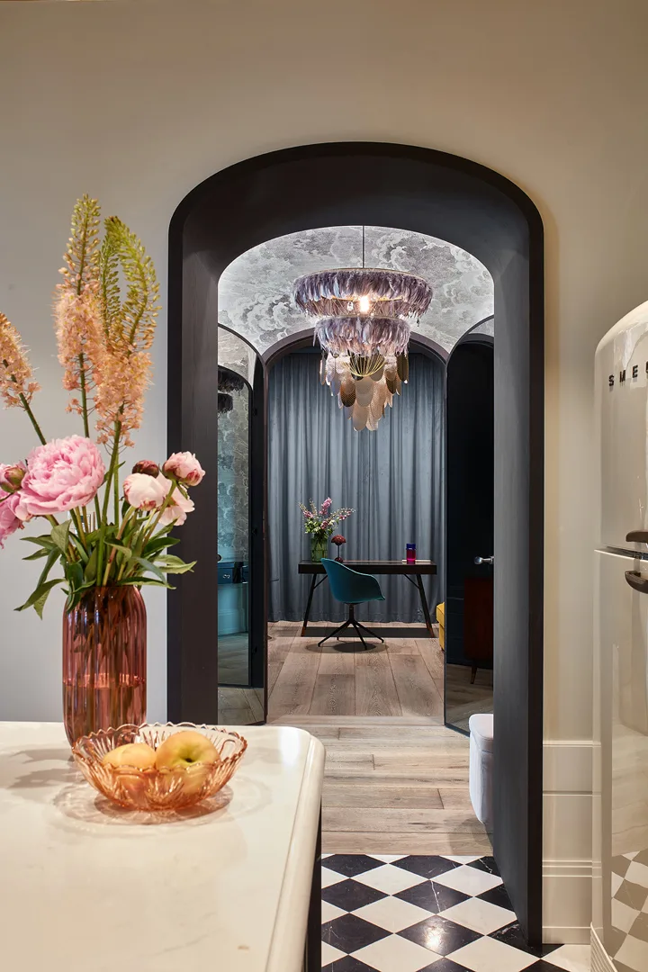 Łukowate przejścia, niczym tunele, prowadzą w nieoczywistych kierunkach. Portale ,,opowiadają” historię mieszkania, wyznaczają rytm i budują dramaturgię, którą wzmacniają sensualne kolory: burgundy, róże, czerń, szmaragd i złoto.