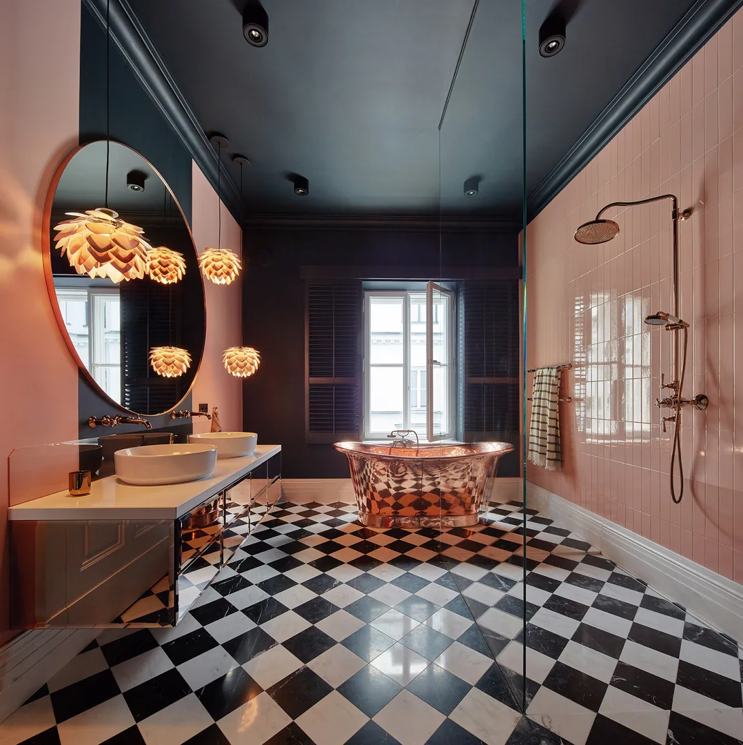 Miedziane regały w salonie i wolnostojąca wanna w głównej łazience to dzieła rzemiosła: przyciągają wzrok jak artystyczne obiekty, a jednocześnie zachowują pełną funkcjonalność, stapiając się z przestrzenią w naturalny, wyważony sposób.