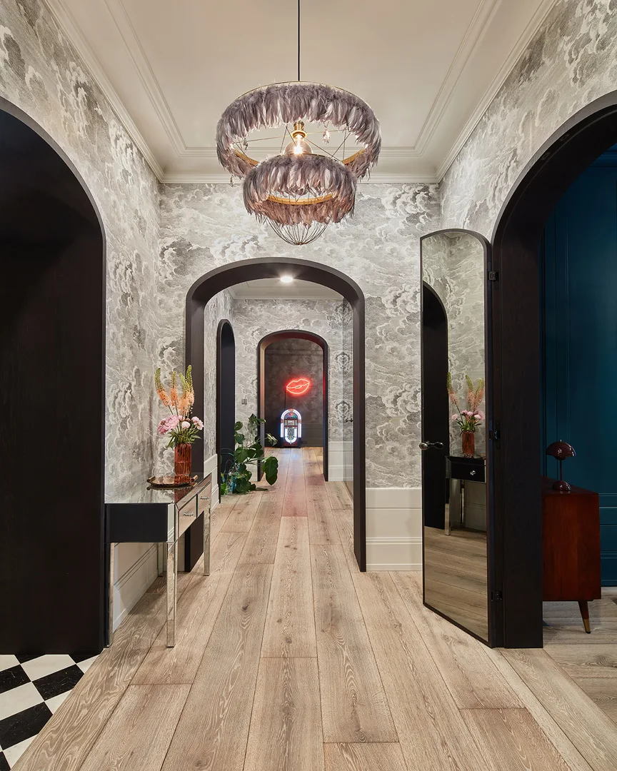 Apartament ten jest dowodem na to, że we wnętrzach najbardziej fascynujące są spotkania pozornie odległych światów. Z jednej strony – przedwojenna Warszawa: elegancka, klasyczna, pełna szlachetnych proporcji, detalu i ponadczasowych materiałów. Z drugiej – subtelna magia rodem z Wonderland: gra światłem i cieniem, portale prowadzące ku nieoczywistym przestrzeniom, oniryczne przeskalowania i iluzje, które nadają mieszkaniu wymiaru bardziej emocjonalnego niż dosłownie architektonicznego.