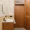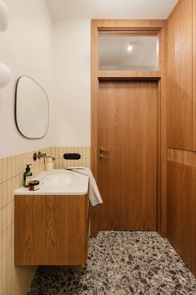 Tu najmocniej słychać retro‑nutę. Ciepłe płytki „cegiełki” układane pionowo z kontrastową fugą przywołują lata 70., ale w eleganckiej, współczesnej interpretacji. Drewniana zabudowa i ryflowane detale nawiązują do kuchni, spajając projekt. Na posadzce lastryko – subtelny ukłon w stronę modernistycznych tradycji warszawskich kamienic.