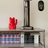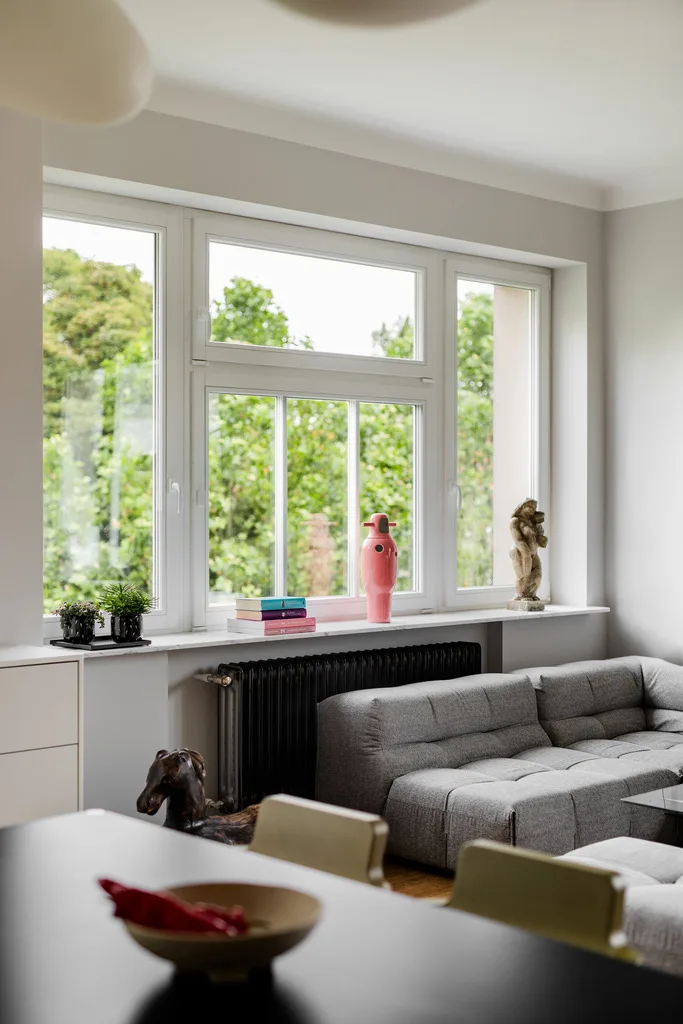 W części wypoczynkowej uwagę przyciąga pikowana sofa polskiej marki Veer w gołębioszarym odcieniu, dopełniona kultowym fotelem Maggiolina i stolikiem ze szklanym blatem. Ściany i parapety przejmują rolę ekspozytorów: obrazy, grafiki, linoryty, fotografie i rzeźby – w tym prace Jaimego Hayona – nadają ton całej opowieści. Paleta szarości, beży i bieli świadomie tworzy tło dla sztuki, nie odwrotnie.