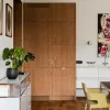 Długi korytarz z minimalistyczną zabudową mieści pojemne szafy i porządkuje codzienność. Neutralne ściany i drewniana podłoga budują bazę, która nie próbuje konkurować z tym, co wydarzy się dalej. To spokojny wstęp – zapowiedź gry światła, faktur i kolorów.