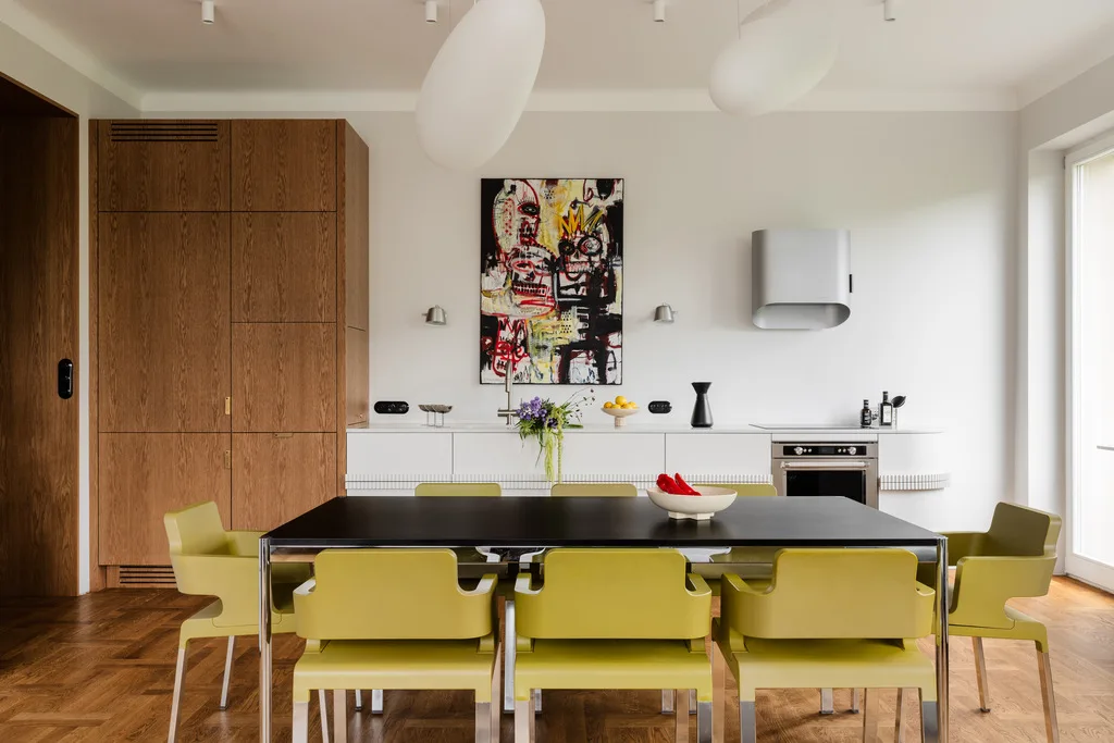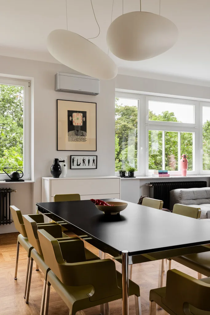 Centrum to czarny, designerski stół USM Haller. Towarzyszą mu geometryczne krzesła projektu Christophe’a Marchanda w limonkowej zieleni. Ten odważny ton ożywia neutralną bazę i podkreśla temperament właścicielki. Obok – komoda USM Haller, elegancko przechowująca drobiazgi. Powracające metaliczne detale spajają całość z innymi elementami wystroju.