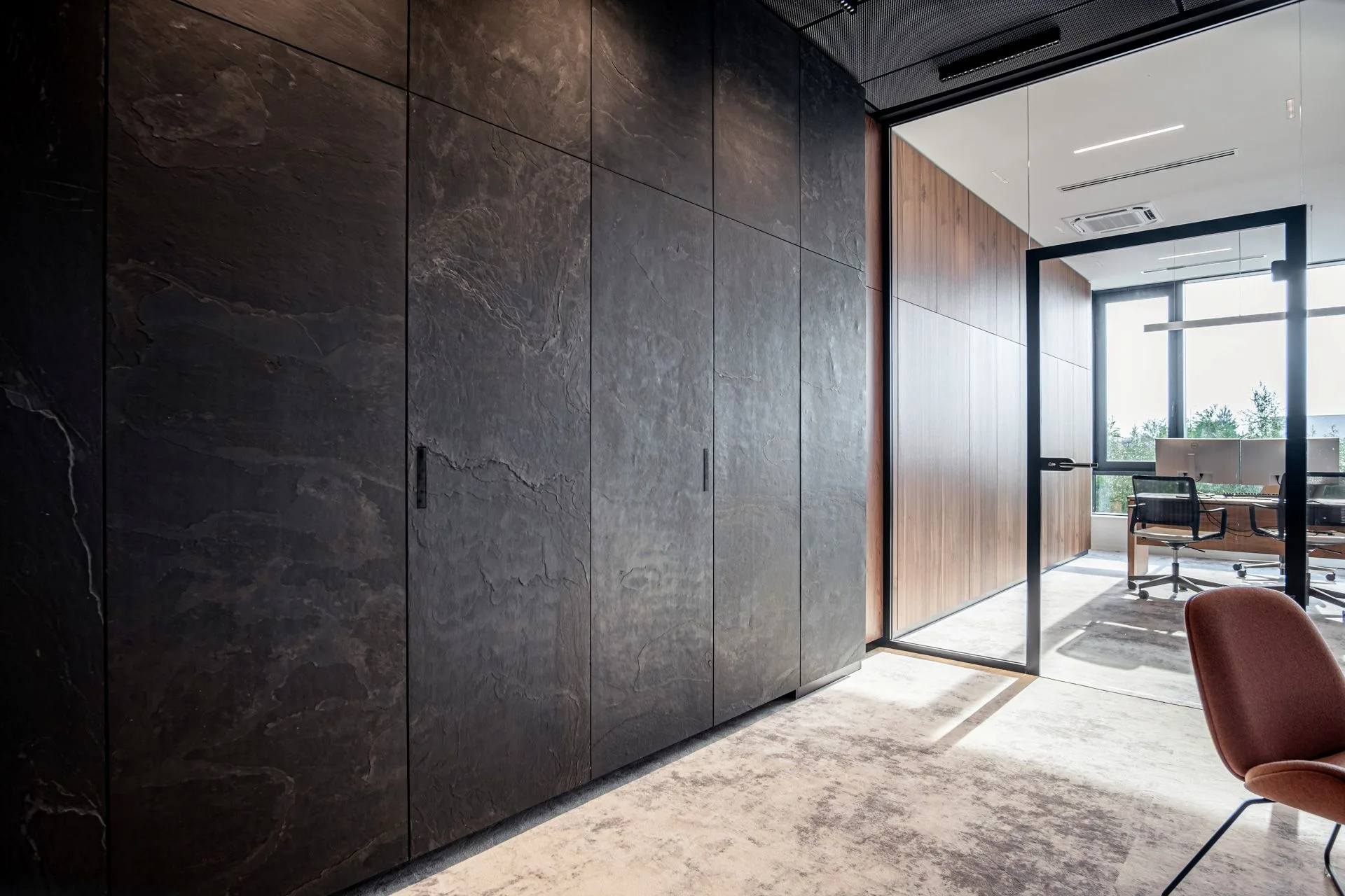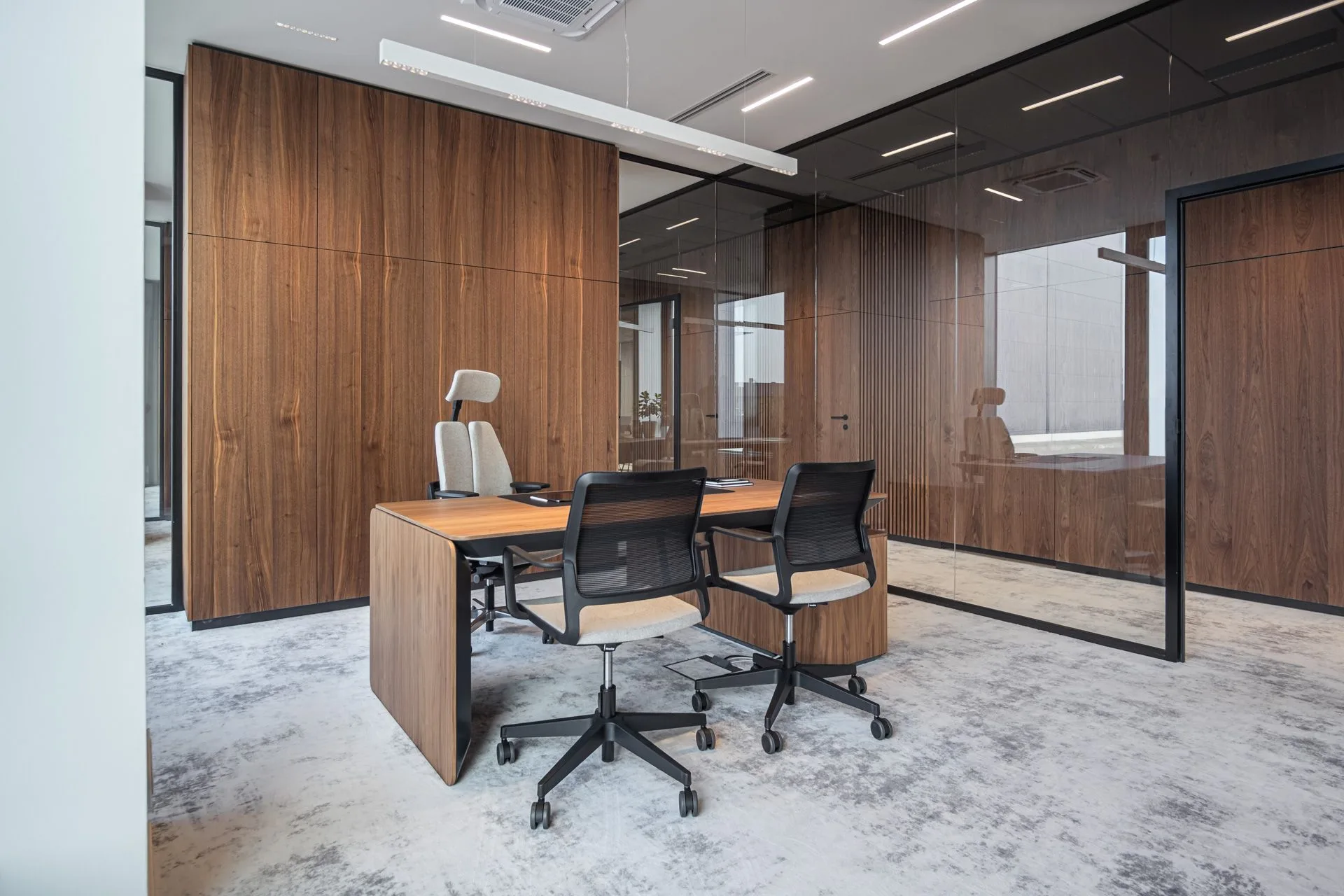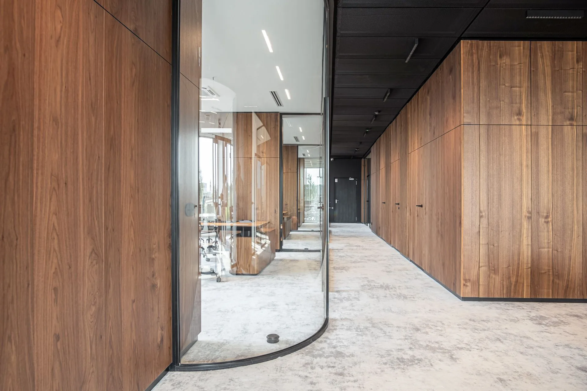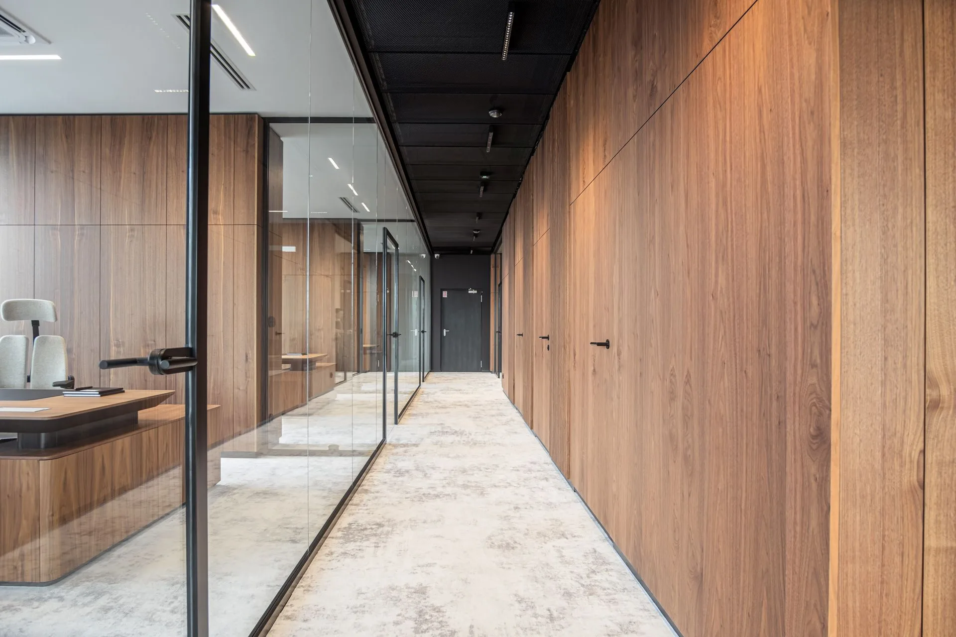 Przestrzeń zarządu to osobna opowieść – pełna wyrafinowania i harmonii. Dominuje tu ciemny orzech amerykański – naturalny fornir, który oplata ściany, meble i sufity, budując jednolitą narrację. Wszystkie elementy – od szaf, przez sufity, po przeszklenia – zsynchronizowane są jak nuty w partyturze Bacha. Nie ma tu miejsca na przypadek – są za to milimetrowe podziały, idealna symetria i miękka, akustyczna wykładzina, która koi każdy krok.