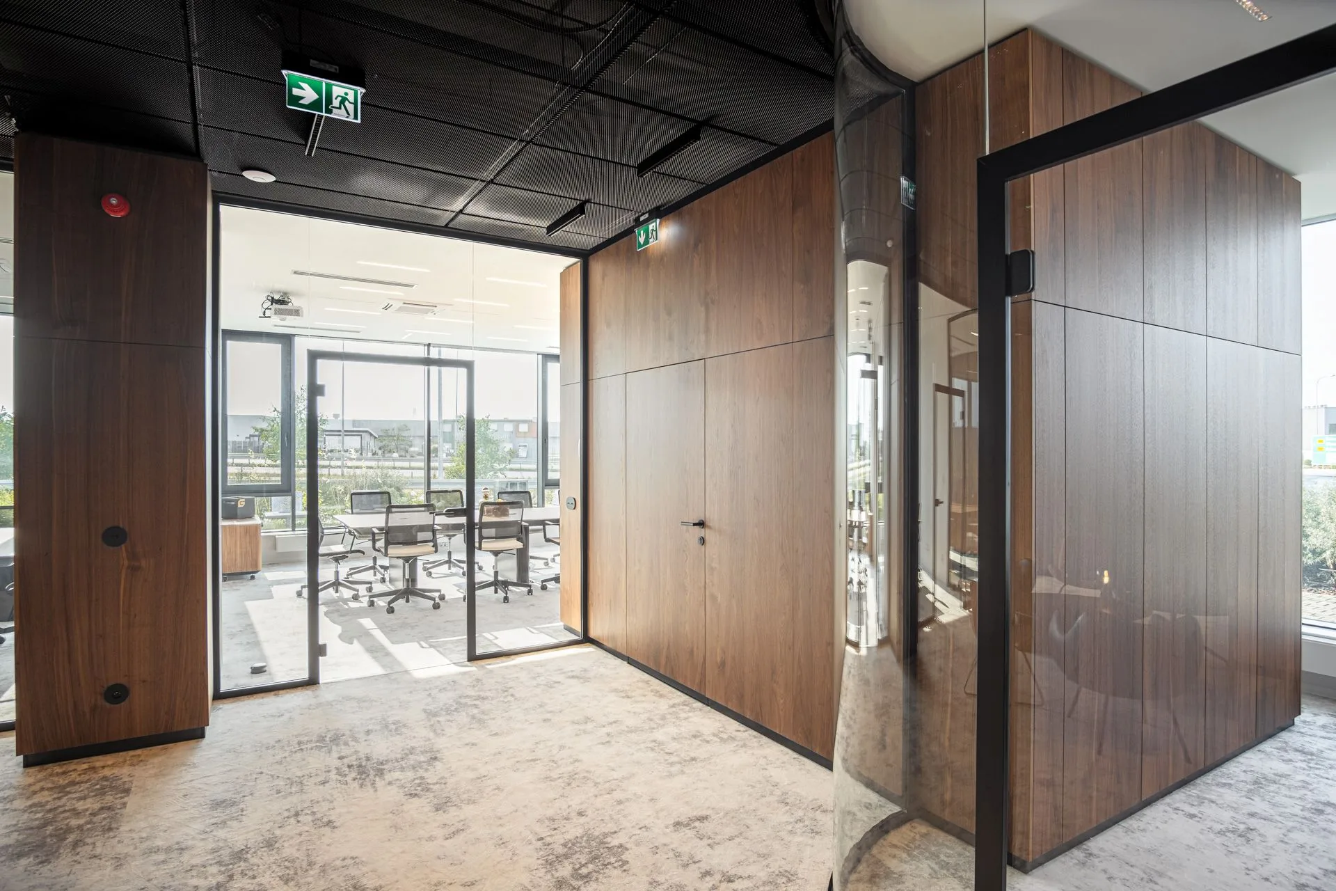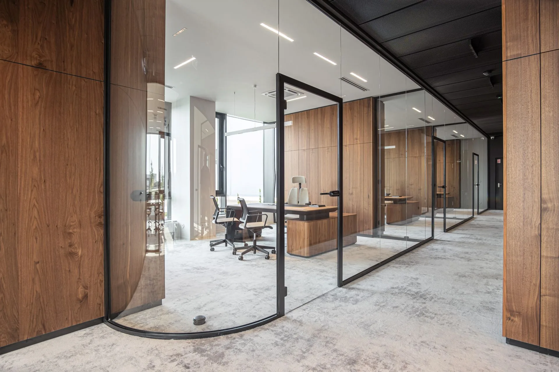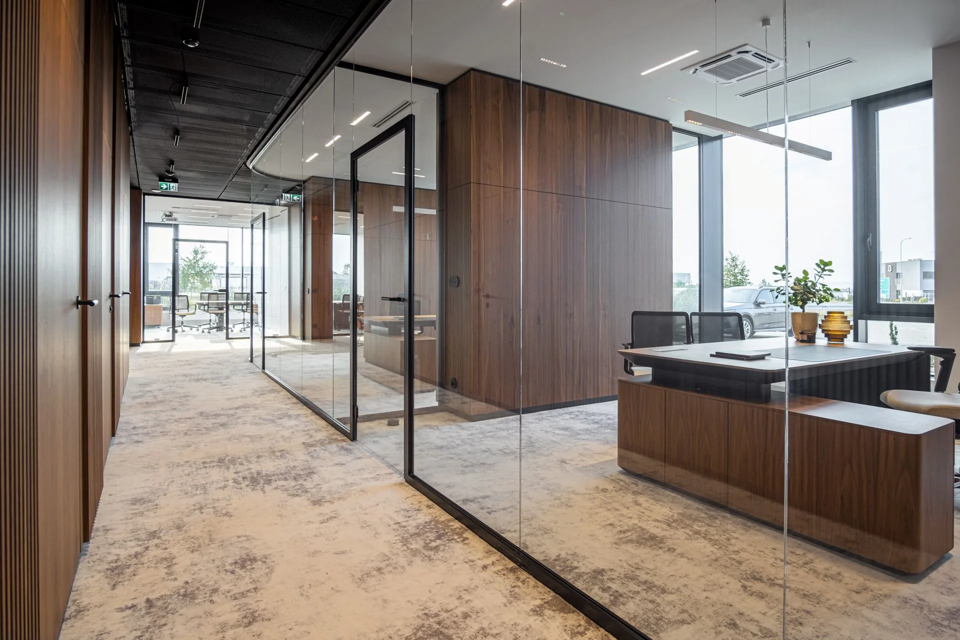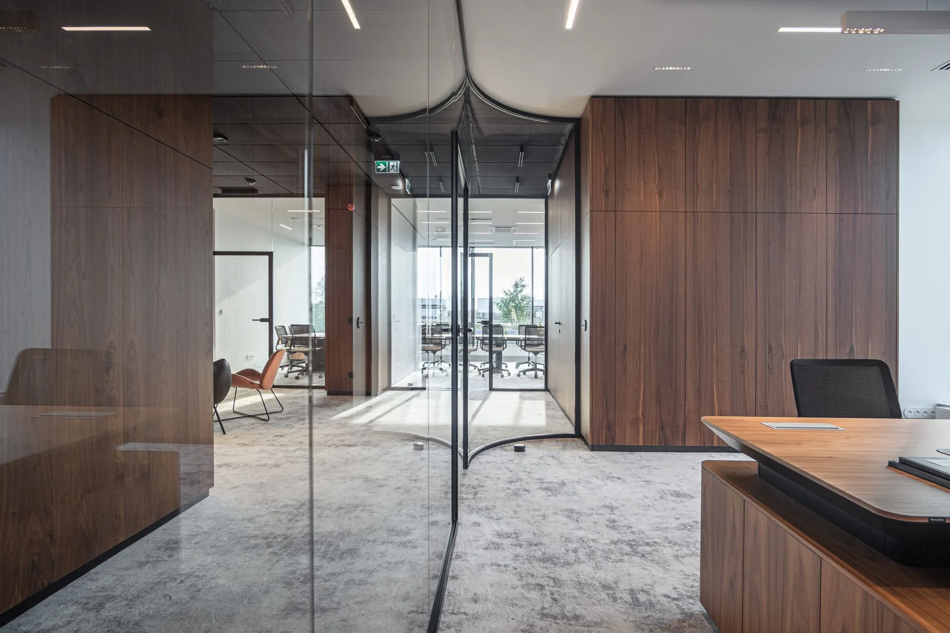 Przestrzeń zarządu to osobna opowieść – pełna wyrafinowania i harmonii. Dominuje tu ciemny orzech amerykański – naturalny fornir, który oplata ściany, meble i sufity, budując jednolitą narrację. Wszystkie elementy – od szaf, przez sufity, po przeszklenia – zsynchronizowane są jak nuty w partyturze Bacha. Nie ma tu miejsca na przypadek – są za to milimetrowe podziały, idealna symetria i miękka, akustyczna wykładzina, która koi każdy krok.