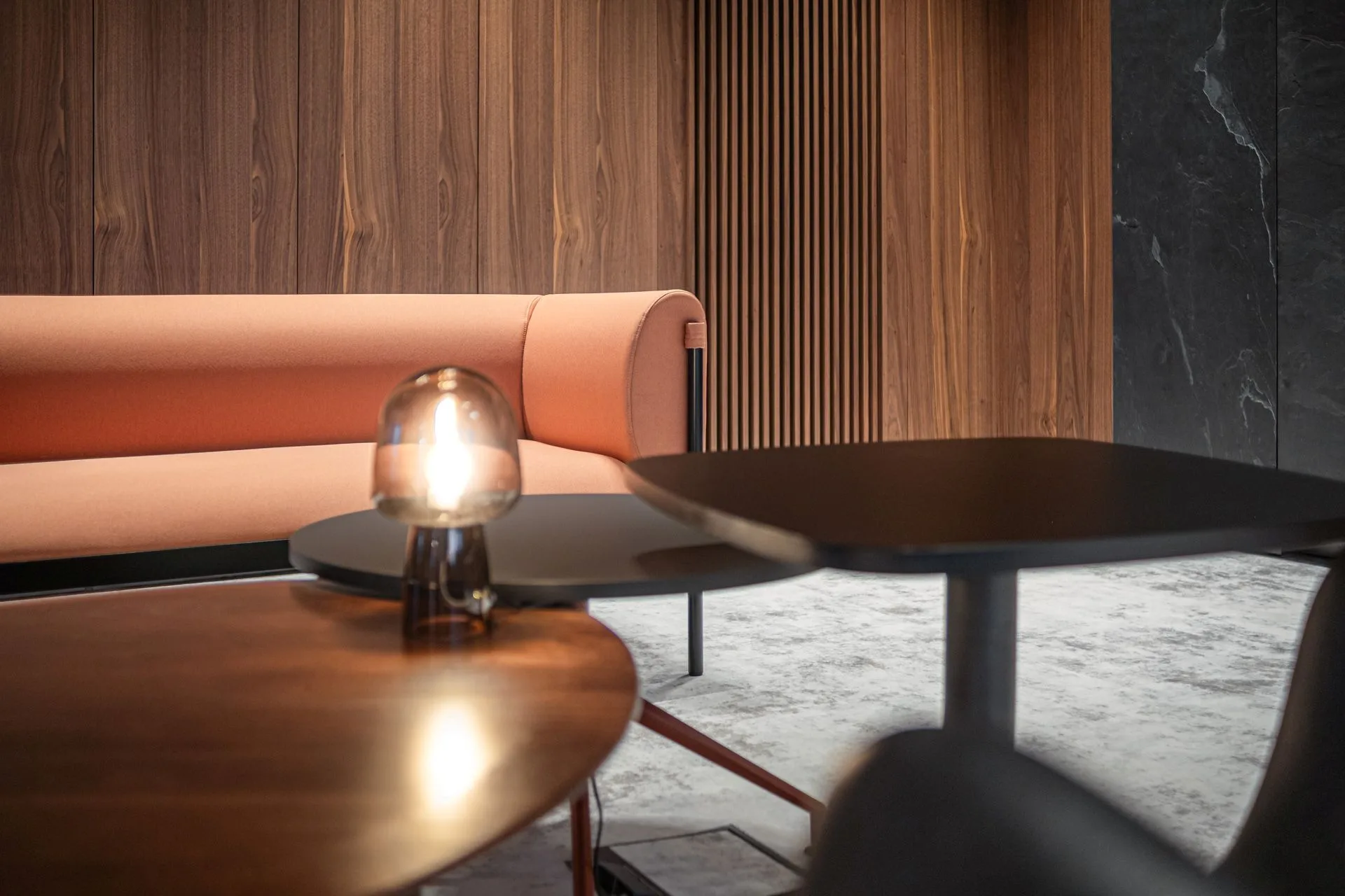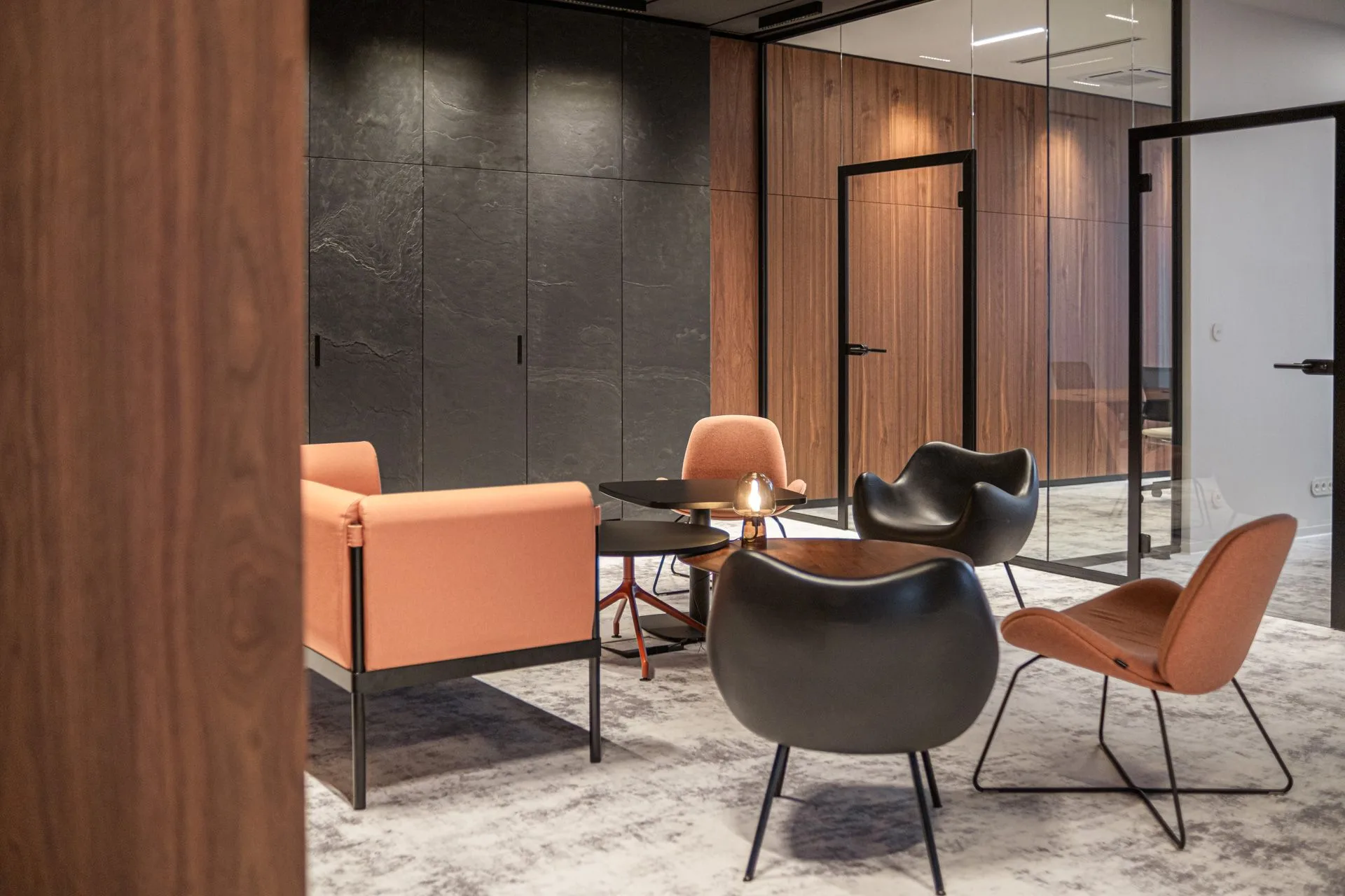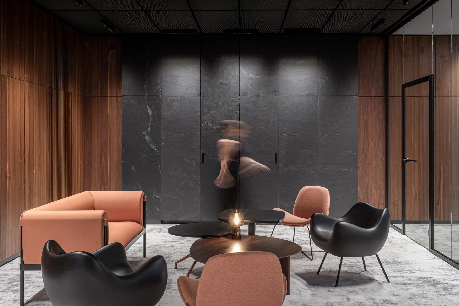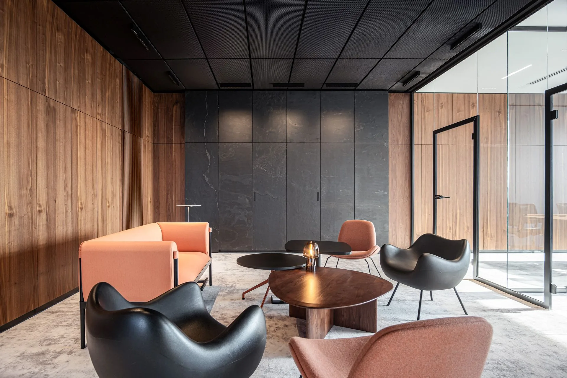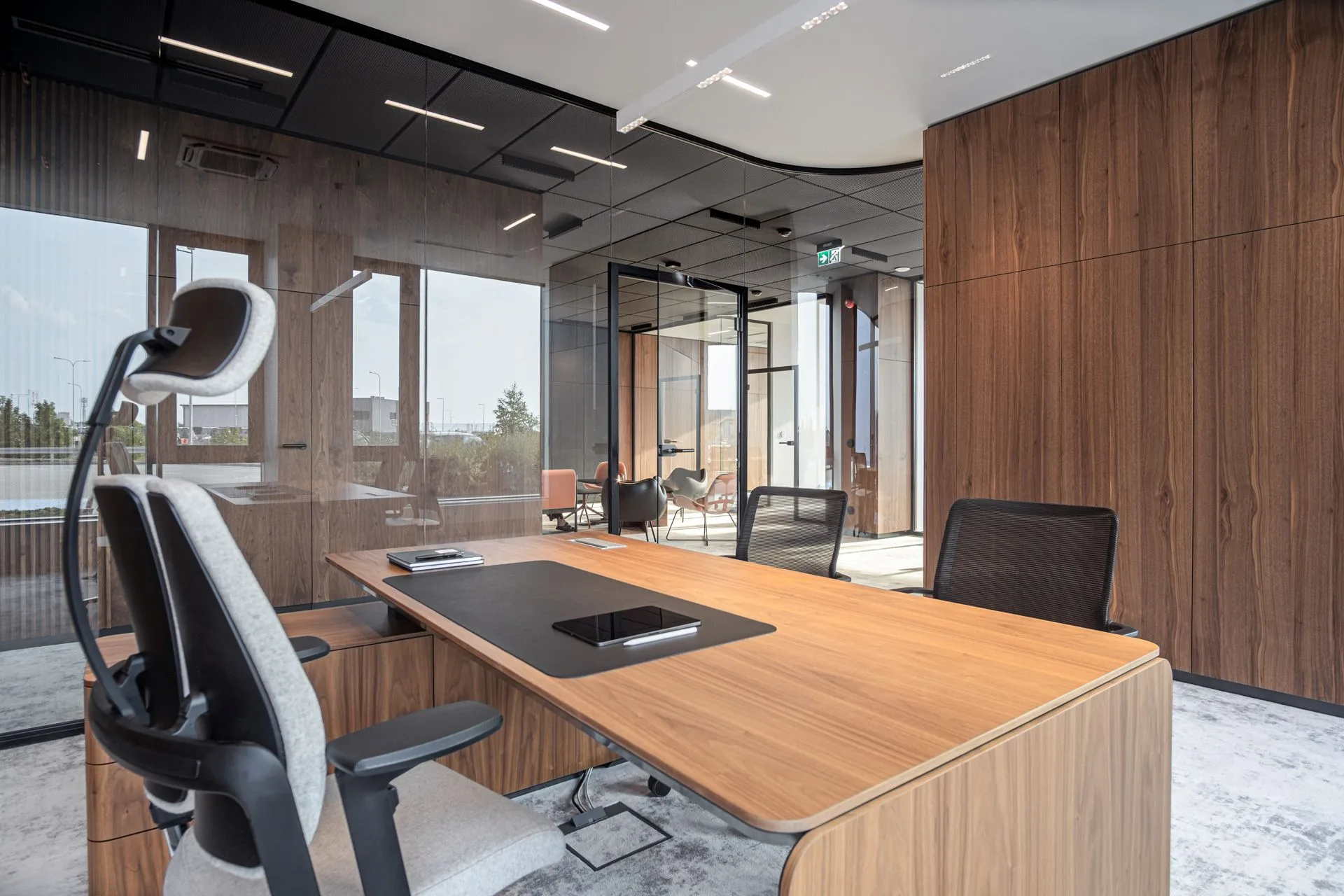 Przestrzeń zarządu to osobna opowieść – pełna wyrafinowania i harmonii. Dominuje tu ciemny orzech amerykański – naturalny fornir, który oplata ściany, meble i sufity, budując jednolitą narrację. Wszystkie elementy – od szaf, przez sufity, po przeszklenia – zsynchronizowane są jak nuty w partyturze Bacha. Nie ma tu miejsca na przypadek – są za to milimetrowe podziały, idealna symetria i miękka, akustyczna wykładzina, która koi każdy krok.