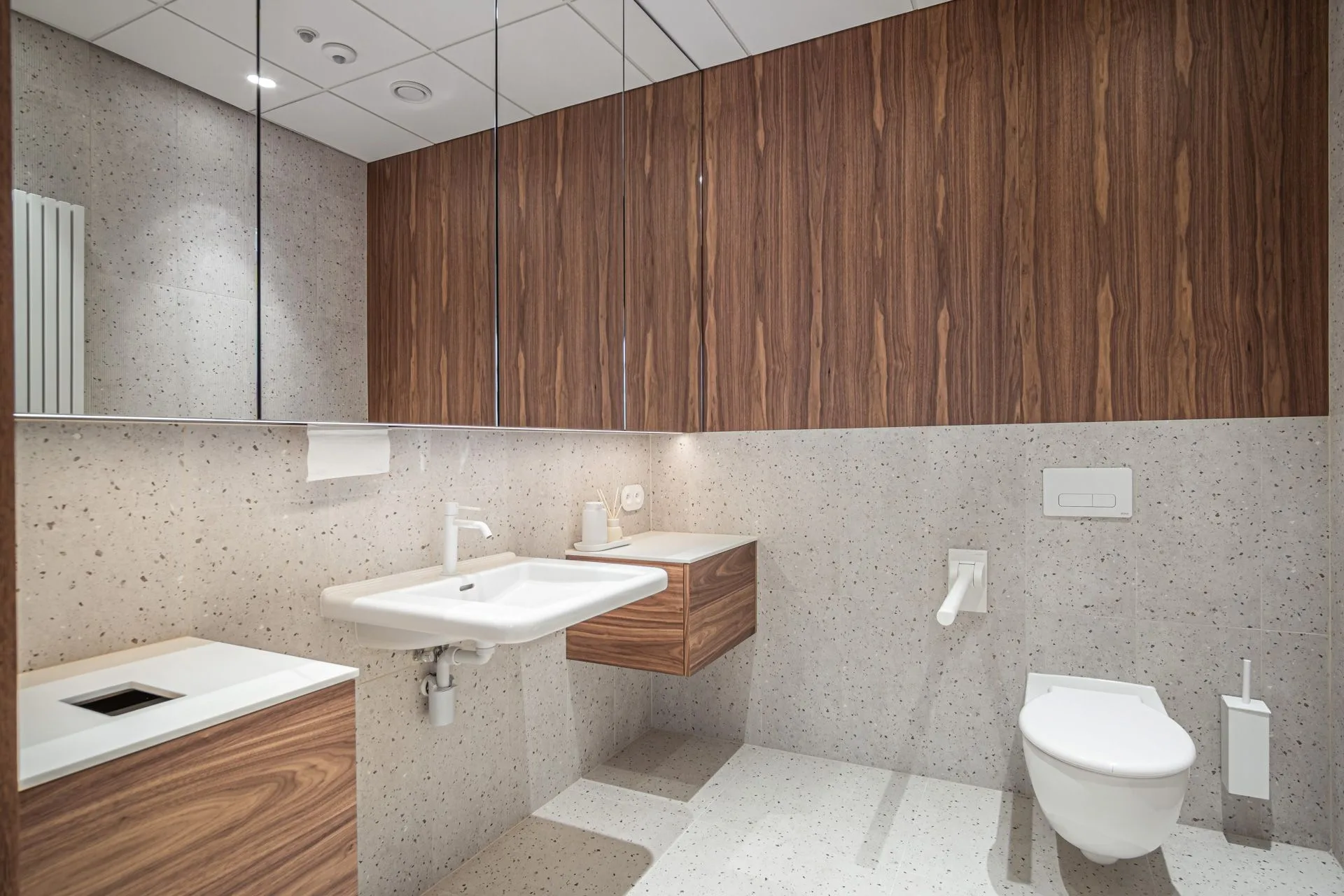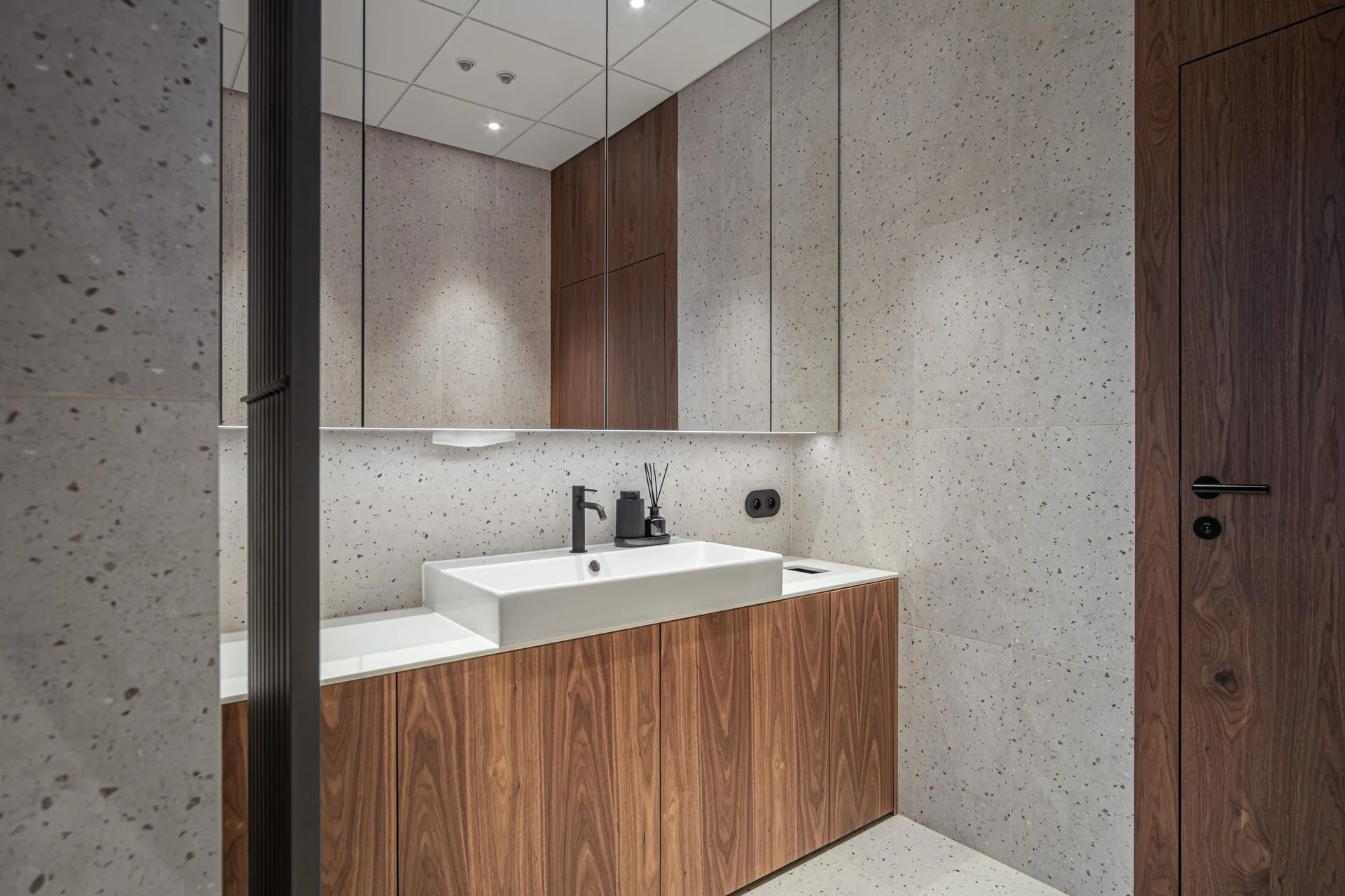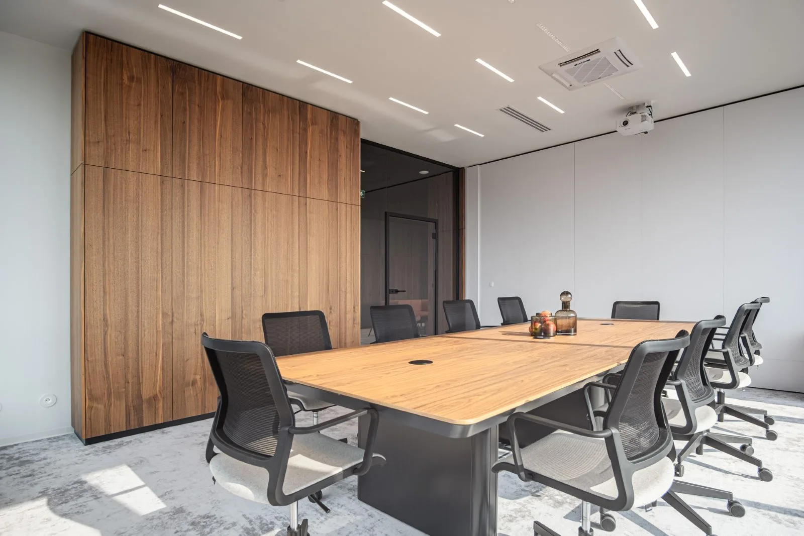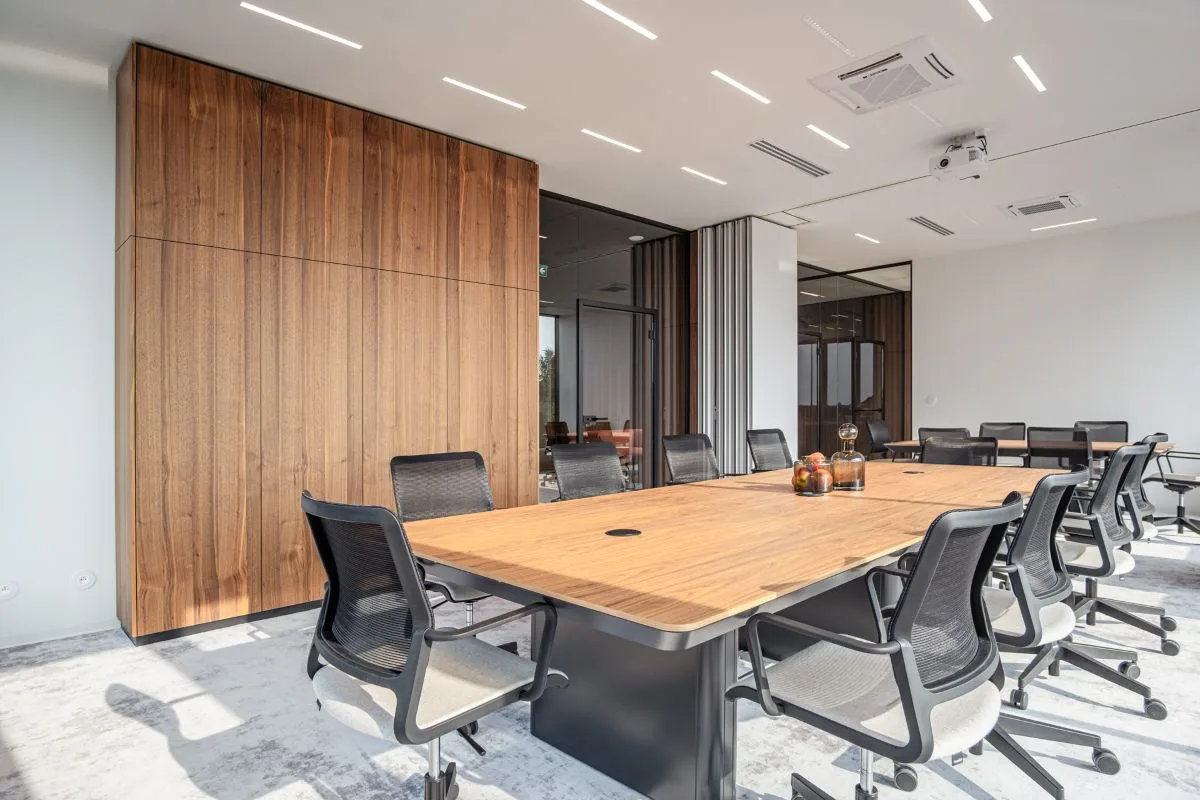 Przestrzeń zarządu to osobna opowieść – pełna wyrafinowania i harmonii. Dominuje tu ciemny orzech amerykański – naturalny fornir, który oplata ściany, meble i sufity, budując jednolitą narrację. Wszystkie elementy – od szaf, przez sufity, po przeszklenia – zsynchronizowane są jak nuty w partyturze Bacha. Nie ma tu miejsca na przypadek – są za to milimetrowe podziały, idealna symetria i miękka, akustyczna wykładzina, która koi każdy krok.