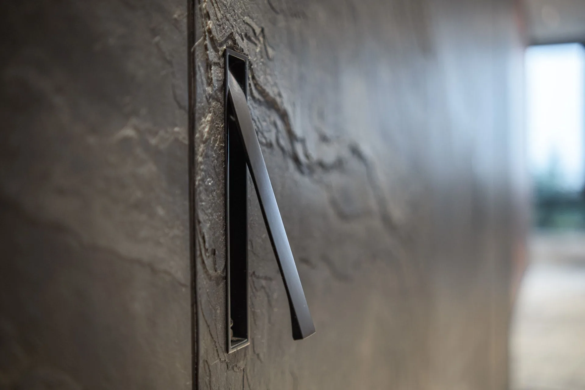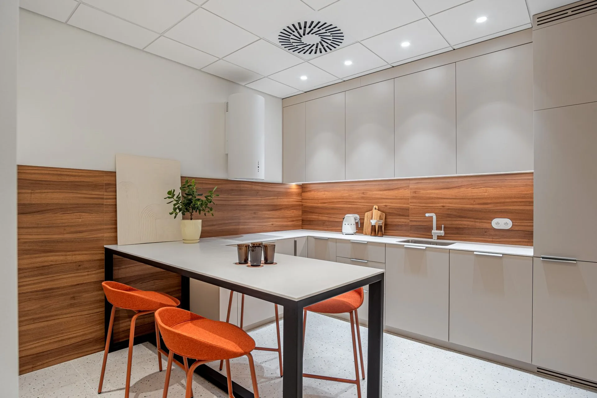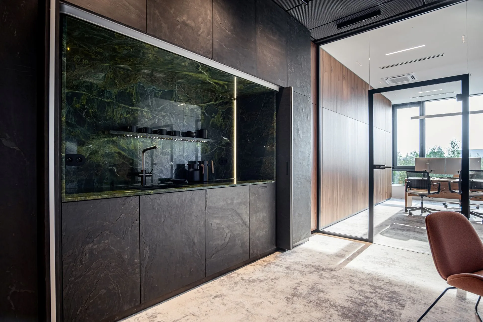 Nieczęsto zdarza się, by kuchnia znajdowała się tuż przy wejściu. Ale tutaj, w Gremboxie, to strefa wejściowa jest sercem – miejscem spotkań, burz mózgów i pierwszych powitań gości. To właśnie tam ukryto kuchnię, która niczym scena teatralna – odsłania się tylko wtedy, gdy gra swą najważniejszą rolę. Z wnęki wykonanej z inspiracji spiekiem Marazzi Verde Borgogna, wyłania się wielki ekspres – niemal pomnik pasji właścicieli do idealnie zaparzonej kawy. To właśnie tutaj rytuał parzenia kawy staje się preludium każdej inspirującej rozmowy.