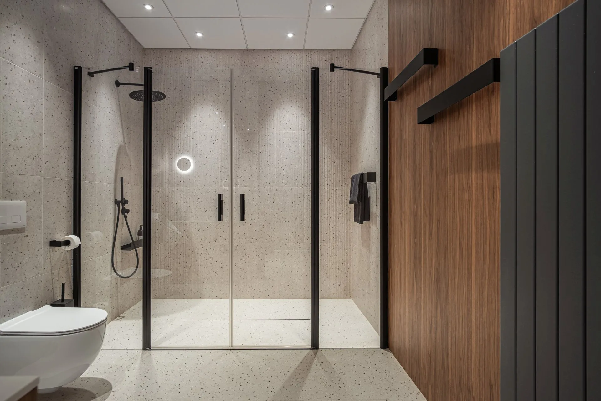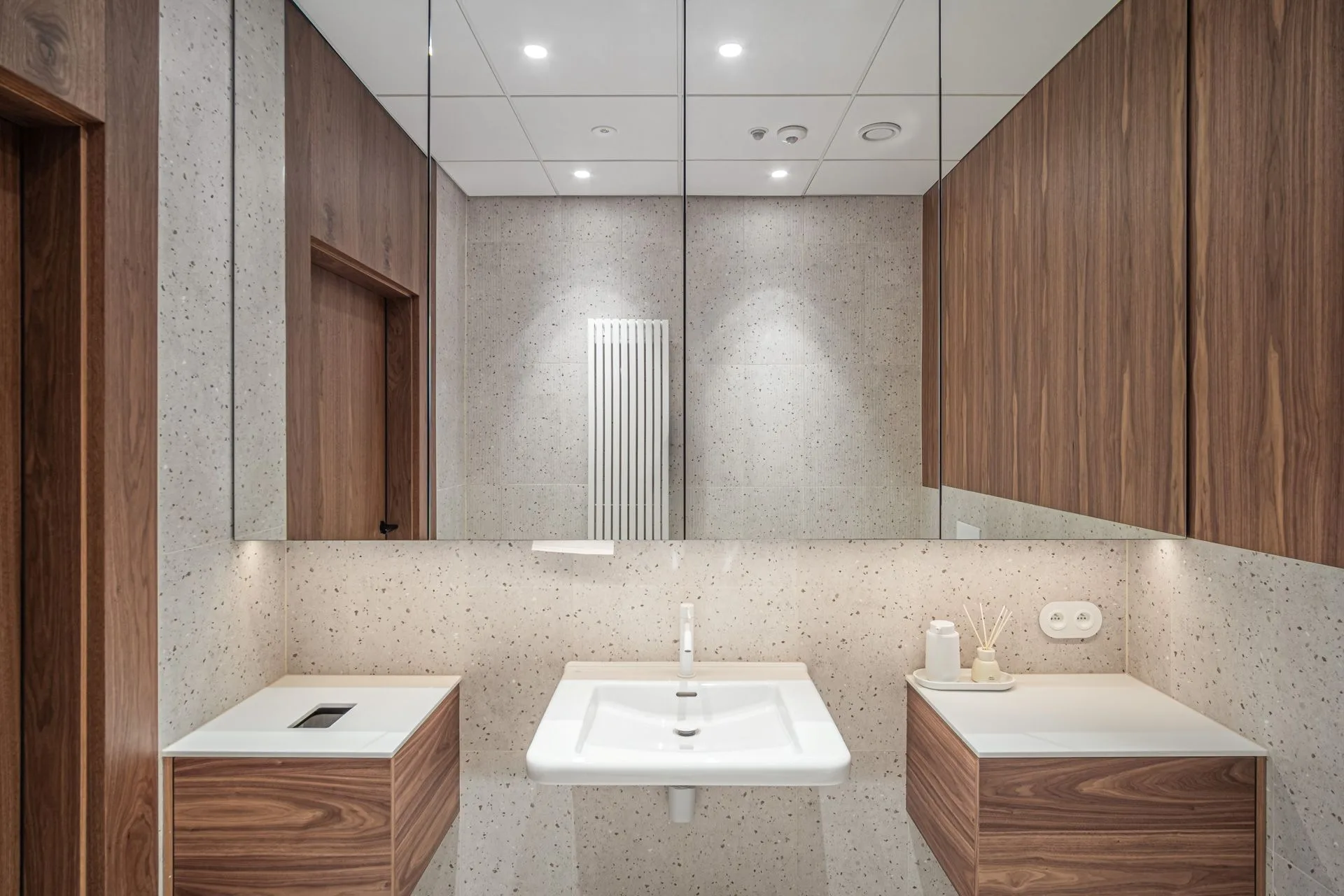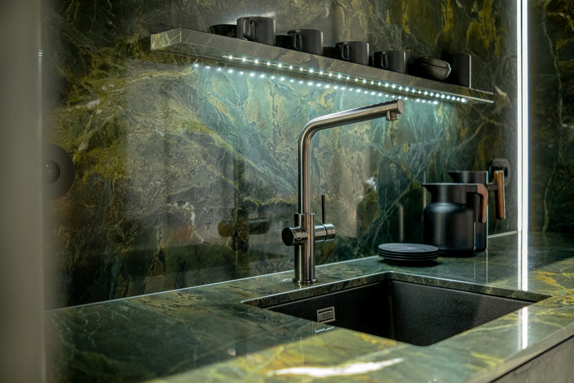 Nieczęsto zdarza się, by kuchnia znajdowała się tuż przy wejściu. Ale tutaj, w Gremboxie, to strefa wejściowa jest sercem – miejscem spotkań, burz mózgów i pierwszych powitań gości. To właśnie tam ukryto kuchnię, która niczym scena teatralna – odsłania się tylko wtedy, gdy gra swą najważniejszą rolę. Z wnęki wykonanej z inspiracji spiekiem Marazzi Verde Borgogna, wyłania się wielki ekspres – niemal pomnik pasji właścicieli do idealnie zaparzonej kawy. To właśnie tutaj rytuał parzenia kawy staje się preludium każdej inspirującej rozmowy.