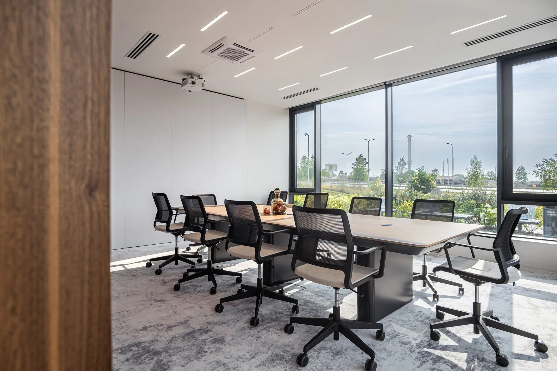 Idąc dalej, trafiamy do strefy konferencyjnej, gdzie dwie sale oddzielone mobilną ścianką dają się dowolnie aranżować. To przestrzeń elastyczna, dynamiczna jak dzisiejszy rynek. Meble od Nowy Styl idealnie wpisują się w klimat wnętrza – ich prostota nie kłóci się z elegancją, a wygoda sprzyja koncentracji.