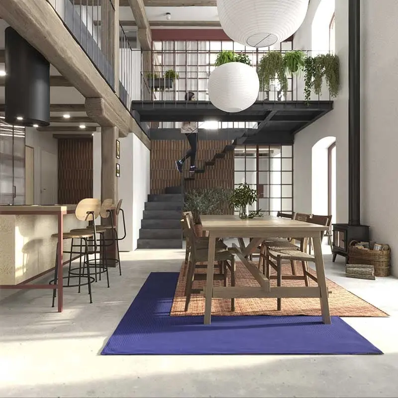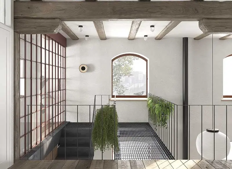 Świadomie zostały użyte z pozoru chłodne materiały, takie jak mikrocement na podłodze czy stalowe elementy schodów i balustrad. Nawiązują one nie tylko do rzemieślniczego charakteru tego miejsca, ale będąc materiałami ponadczasowymi, stanowią tło dla wszelkich elementów wyposażenia wnętrza, które z wraz z upływem czasu będzie się zmieniać, podobnie jak jego mieszkańcy.
