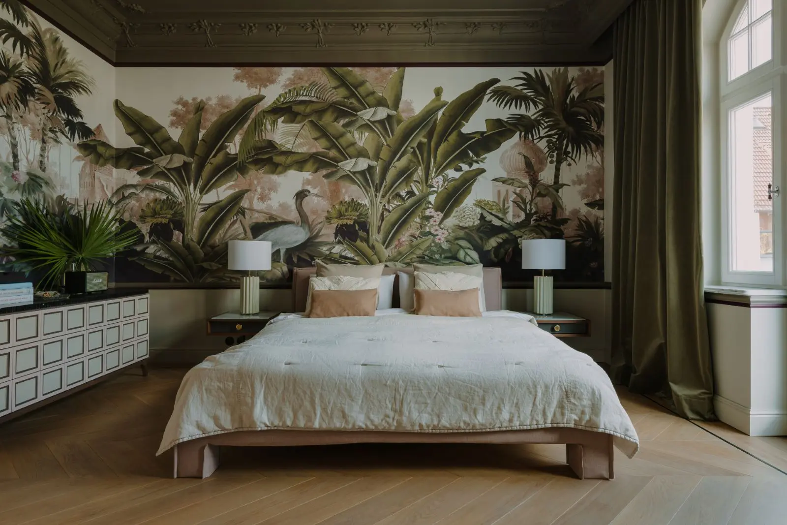 Aranżacja sypialni pozwala na całkowity relaks właścicieli domu. Dzięki tapecie oraz zjawiskowemu zielonemu sufitowi udało się uzyskać namiastkę jungli. W sypialni znajduję się duże łóżko oraz oryginalna komoda zaprojektowana przez architektów z JT Grupy. Kasetonowe fronty ramkowe zostały polakierowane trzema kolorami: beżowym, pudrowym różem i w odcieniu gliny. Podstawa została wykonana z drewna dębowego, bejcowanego na odcień głębokiego brązu, a blat jest z marmuru nero marquina.