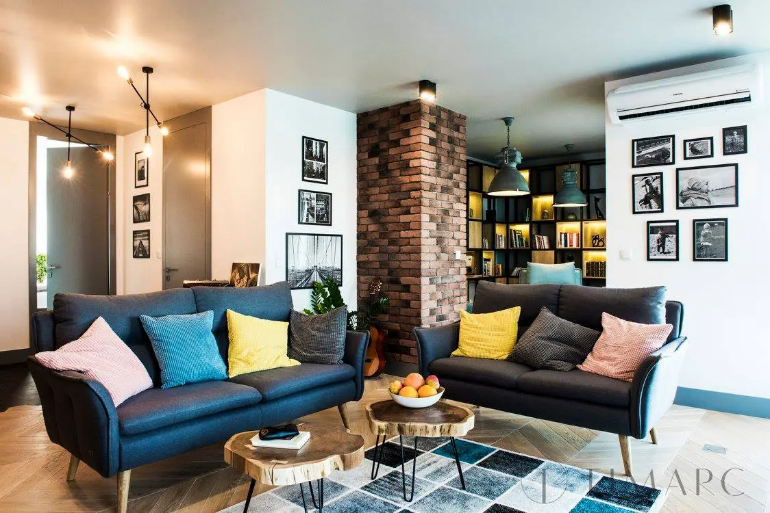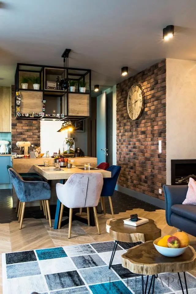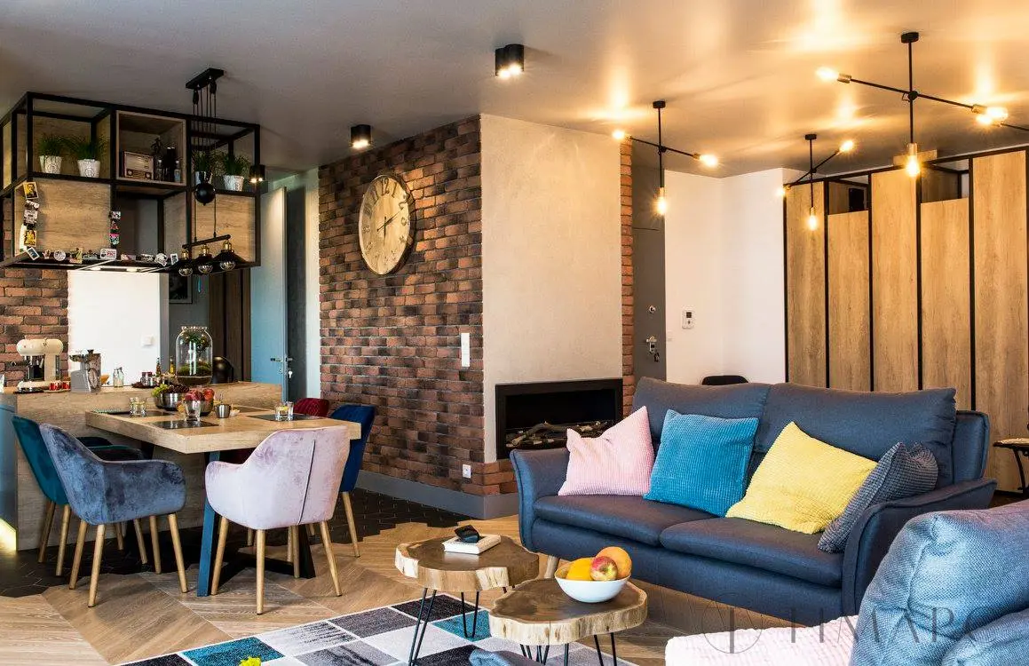 Mieszkania w stylu loft najczęściej urządzają indywidualiści. Cenią sobie ten niepowtarzalny surowy klimat oraz przestrzeń. W tym mieszkaniu charakteru industrialnego nadaję mocno czerwona cegła, jak z prawdziwej fabryki oraz wiele dodatków, jak lampy czy surowy drewniany stolik na metalowych nóżkach. Oryginalność mieszkania uwydatnia się jeszcze bardziej poprzez szczegółowo zaplanowaną aranżację, która oddaje charakter mieszkańców.