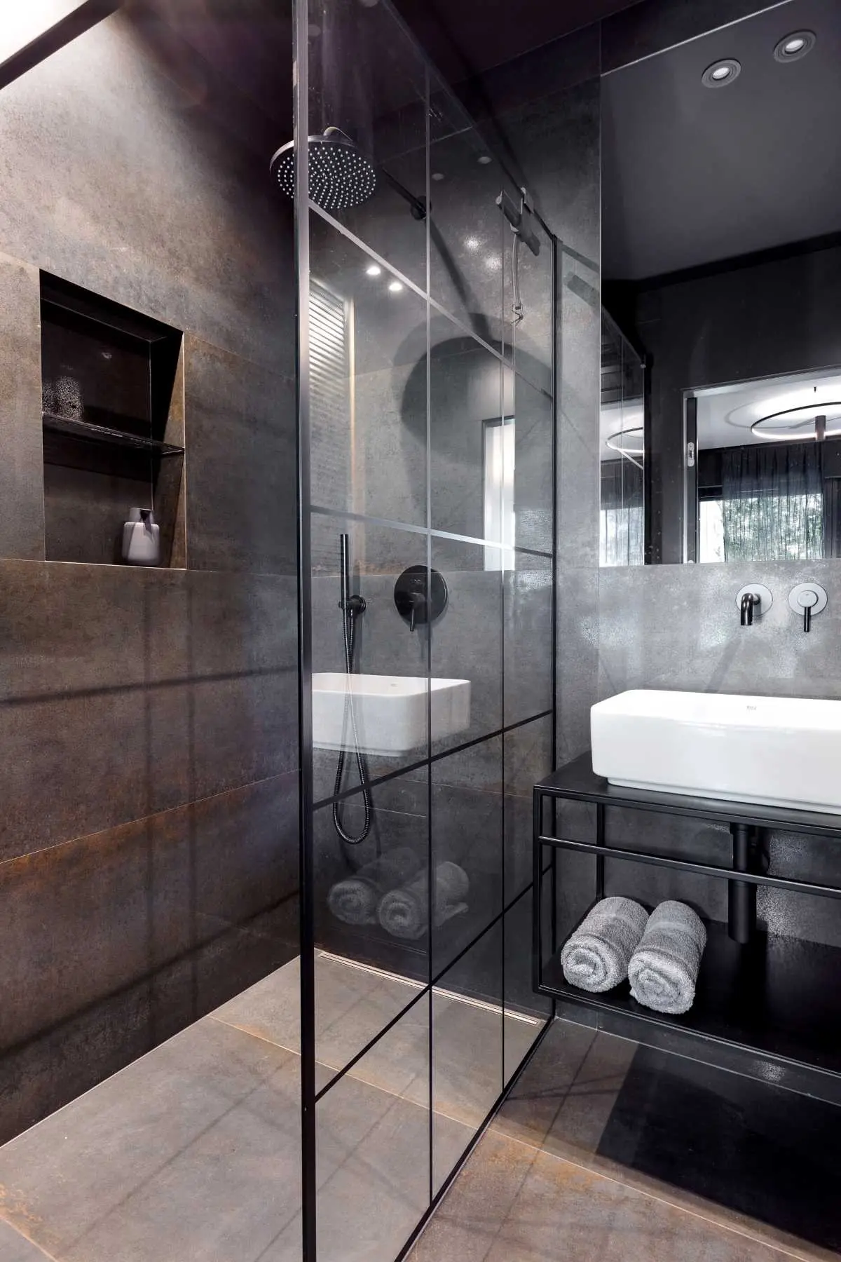 Charakter wnętrza jest bardzo męski, klubowy, kojarzy się z dobrą whisky i aromatycznymi cygarami. Całość otrzymała ciemną kolorystykę, dopełnioną rdzawymi pasmami na grafitowych płytkach, tapicerką krzeseł oraz drewnem, które ociepla aranżację.