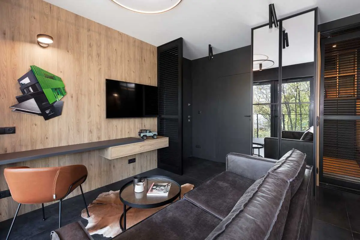 Centralną część mieszkania zajęła komfortowa strefa wypoczynkowa. Jej sercem jest skórzana sofa z okrągłym stolikiem. Meble te stanęły naprzeciwko ściany telewizyjnej o strukturze drewna. A na wypadek, gdyby ważne sprawy służbowe domagały się pilnej reakcji, poniżej ekranu znalazło się biurko z wygodnym fotelem Feston. Blat do pracy jest nieduży – by nie zaznaczyć się za mocno w przestrzeni, która ma służyć przecież głównie do relaksu i regeneracji.