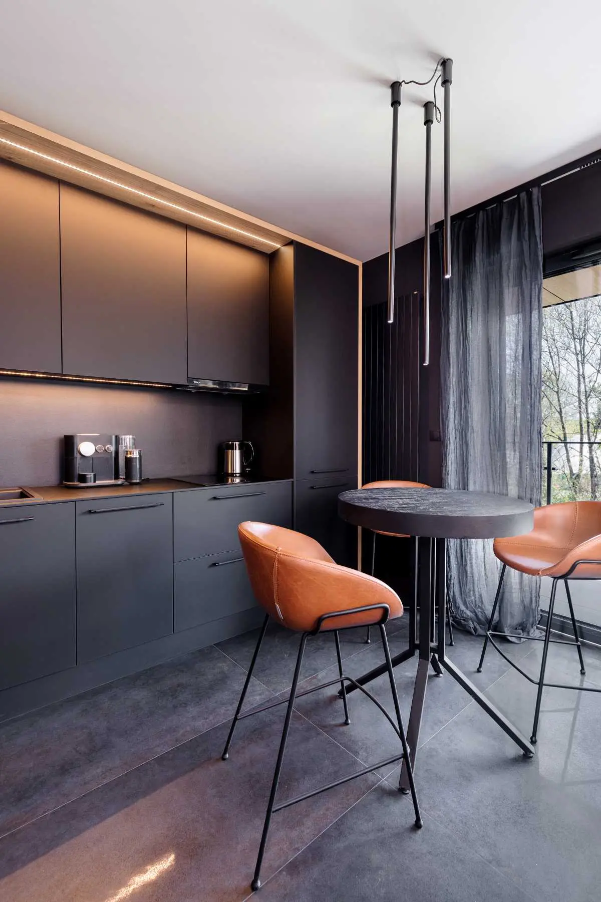 Aby zrealizować potrzeby właściciela kawalerki, niezbędne były wyraźne zmiany w układzie deweloperskim. Kuchnia została przeniesiona do salonu, gdzie zaistniała w postaci kompaktowego, ale w pełni funkcjonalnego aneksu. Towarzyszy mu minijadalnia złożona z okrągłego stołu barowego otoczonego skórzanymi hokerami w kolorze rdzy. Pozycję tej strefy w części dziennej podkreśla minimalistyczna lampa sufitowa.