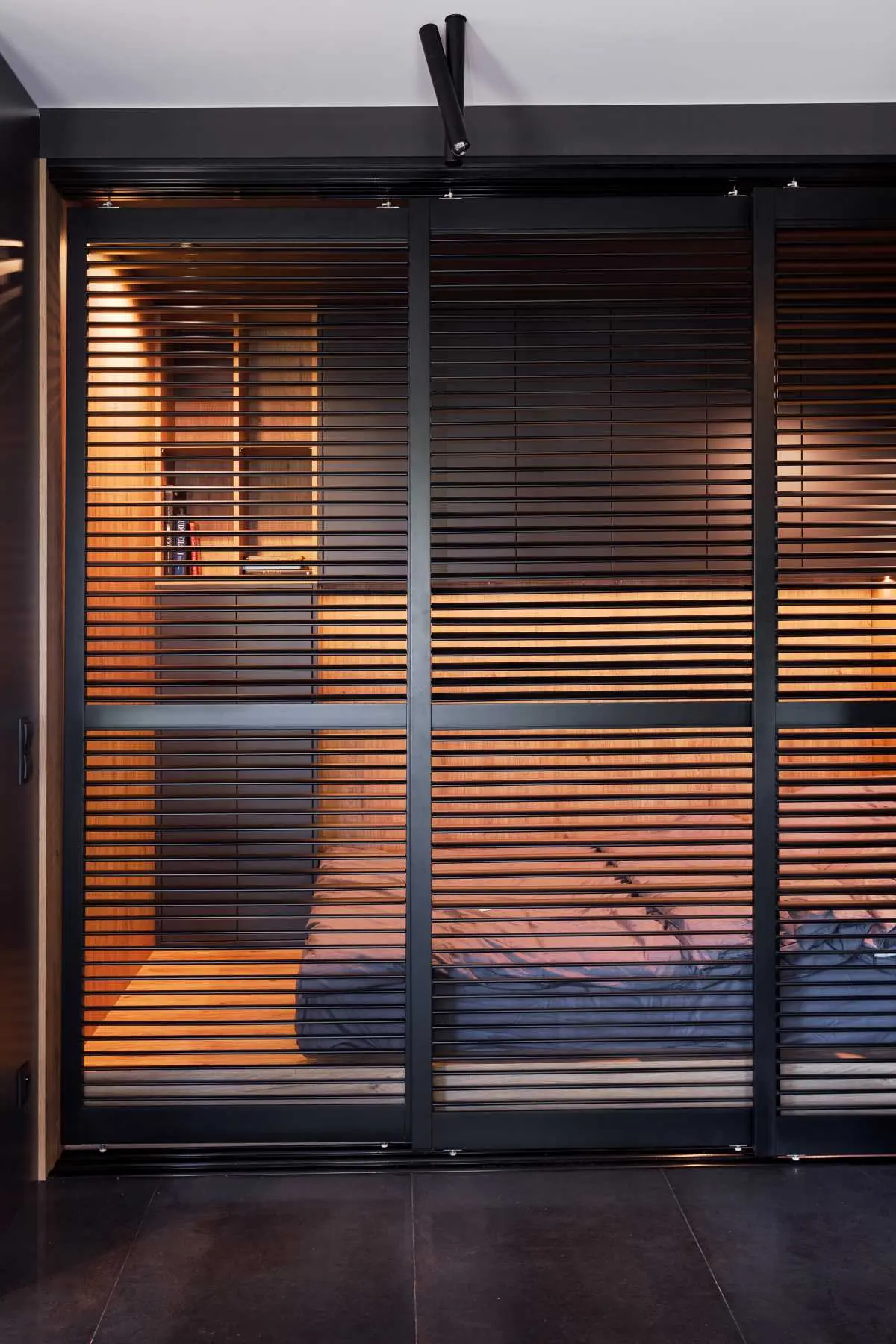 W pierwotnej lokalizacji kuchni powstało miejsce na komfortową i nastrojową sypialnię z łóżkiem na podeście oraz zabudową meblową. Od części dziennej oddzieliły tę przestrzeń shuttersy, czyli żaluzjowe panele. – Ponieważ są przesuwne, umożliwiają wygodny dostęp do tej strefy. Za sprawą ażurów zapewniają odpowiednią cyrkulację powietrza. A jednocześnie obracane pióra w razie potrzeby przysłaniają widok z salonu do sypialni oraz regulują dostęp światła, aby stworzyć dobre warunki do snu – objaśnia Anna Gostomczyk.