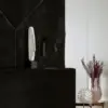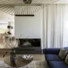 W części wypoczynkowej, znajduje się narożny kominek, stolik kawowy i mocny akcent w postaci granatowego narożnika. Ten kolor jest nieprzypadkowy to znak rozpoznawczy architektki Wioletty Niedzieli-Bogusz, która najchętniej w swoje aranżacje wplata granatowy kolor. Zwieńczeniem aranżacji w salonie jest obraz autorstwa Tomasza Pilitowskiego, wazon studia Mosco Ceramics oraz rzeźba Beaty Boguckiej wyeksponowane na konsoli pod obrazem.