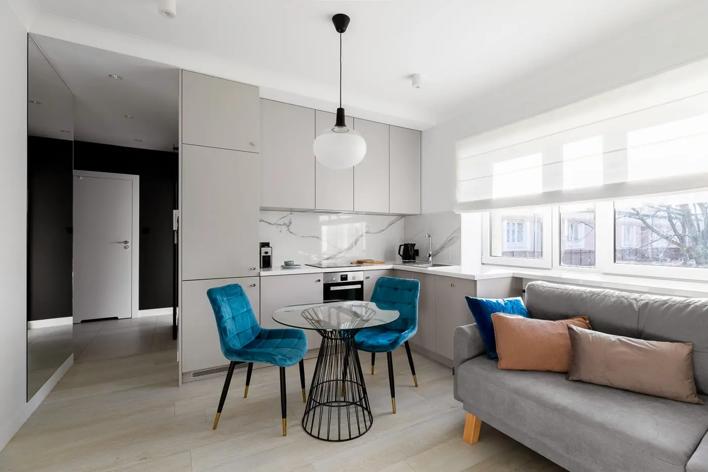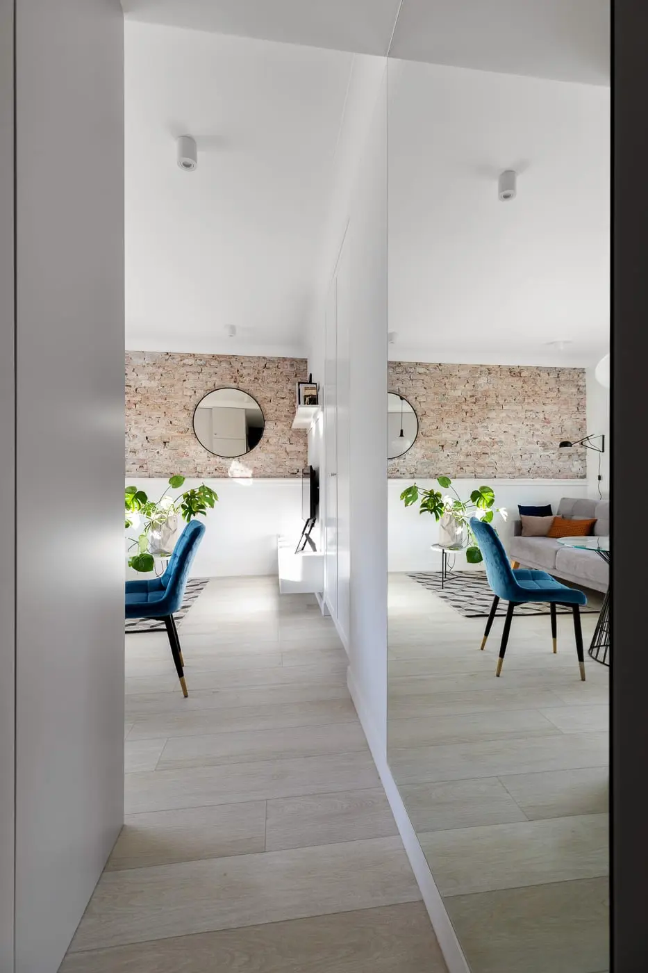 Stylistyka wnętrz oparta jest na bieli z dodatkiem antracytowych i delikatnych, szaro-beżowych akcentów. Przejście z przedpokoju do salonu optycznie powiększa duże ścienne lustro. Aranżację pokoju dziennego dopełnia dywan z geometrycznym wzorem, w którym kolorystyczną analogię odnajdują inne elementy wykończenia wnętrza.