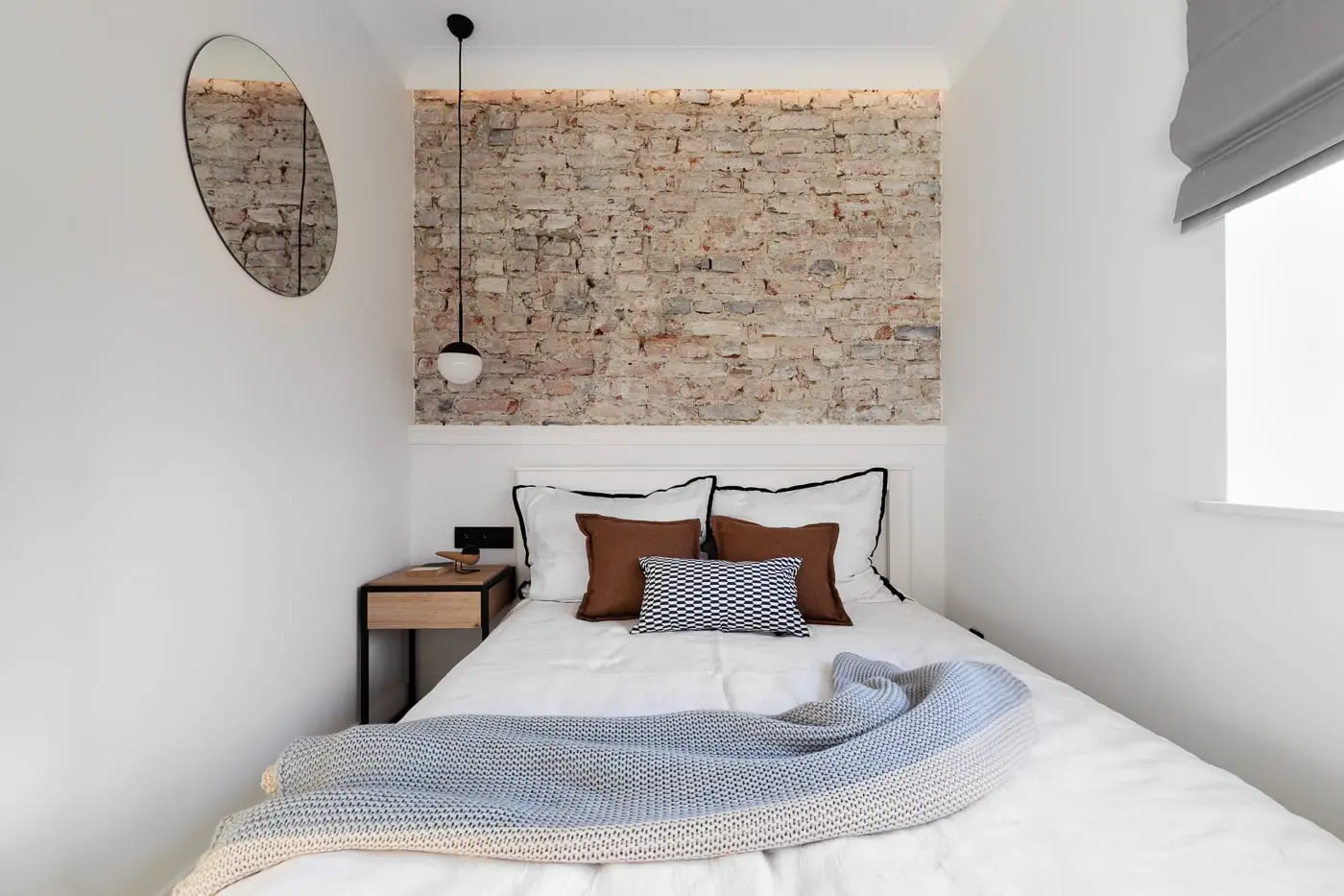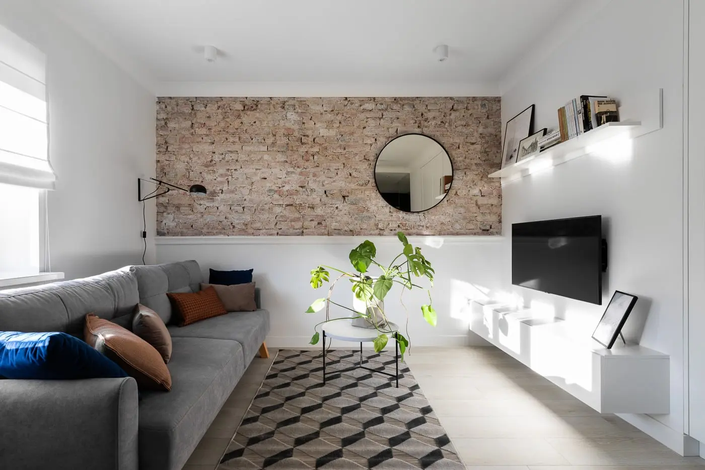 Zamierzony efekt udało się osiągnąć dzięki ekspozycji oryginalnego budulca – cegły, z której powstały budynki na gruzach zniszczonego wojną Muranowa. Materiał ten, choć w wielu miejscach wyszczerbiony, w tym przypadku stanowi o niematerialnej wartości i nadaje wnętrzom nietuzinkowego, autentycznego charakteru. Po wykonaniu próbnej odkrywki projektant zdecydował, z których części ścian zniknie tynk by uzyskać harmonię kompozycyjną pomieszczeń. By nadać eleganckie, klasyczne ramy zarówno cegła jak i sufity pokoju dziennego i sypialni zostały podkreślone prostą sztukaterią. Sama architektura osiedla, jego elewacje, są lekko stylizowane więc zachowanie korelacji między wnętrzem i stylem budynku jest jedną z logicznych dróg do budowania klimatu wnętrza.