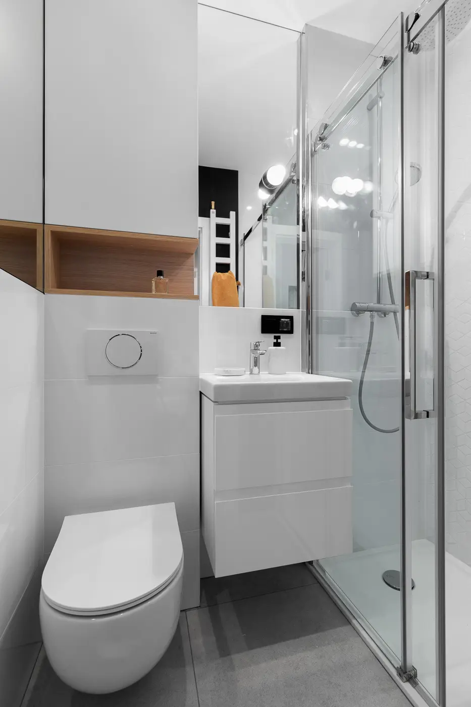 Łazienka jest pomieszczeniem kompaktowym, w którym dominuje biel i lustrzane odbicia, dzięki czemu mała przestrzeń wizualnie zyskuje na metrażu.