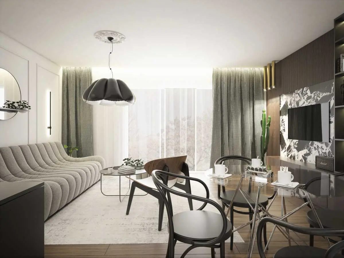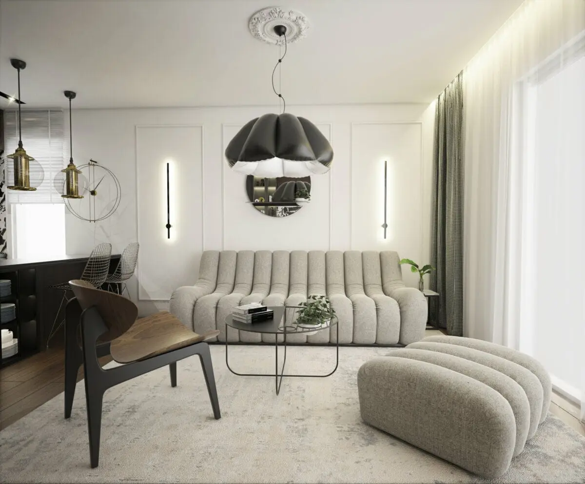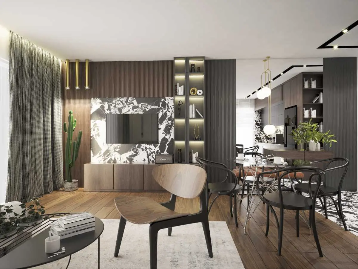 Założeniem było zaprojektowanie przestrzeni nowoczesnej, minimalistycznej w ciemniejszych kolorach, z dużą ilością drewna. Sofa Wadi oraz lampy od Puff Buff oraz sztukateria dodają twista wnętrzu. Właściciel mieszkania bardzo ceni dobre wzornictwo, wysoką jakość projektowanych mebli i dodatków. Dlatego w apartamencie nie mogło zabraknąć i takich detali.