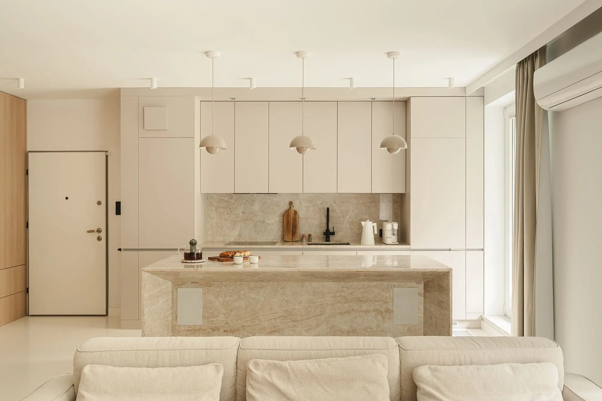 Mieszkanie było wykańczane po raz pierwszy w 2004 r., kiedy powstawał budynek. Od tamtej pory czas się w nim zatrzymał i choć w modzie trend Y2K jest wciąż na topie, to we wnętrzach stosowane wtedy rozwiązania stały się już passe. Egzotyczne i bardzo ciemne drewno na podłodze, kryształowe żyrandole na suficie, fioletowe dodatki… Tak wyglądał ten 85 m2 apartament w dniu jego zakupu. Chcąc zawalczyć o większą ilość światła i przestrzeni, usunięto ścianę, która oddzielała kuchnię od salonu. Na ścianach zamiast zwykłej farby pojawił się mikrocement, czarne kamienne płytki na podłodze w kuchni zamalowano białą żywicą, a zastaną kuchnię z przestarzałym wystrojem zdemontowano i przeniesiono do innego mieszkania. W zaprojektowaniu nowej stonowanej wersji mieszkania pomagała architektka Emilia Jędrejek.