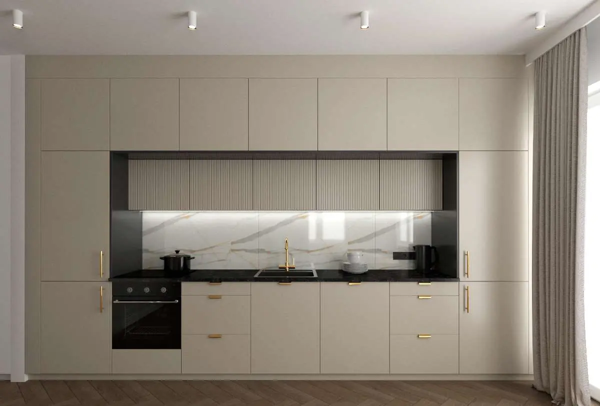 Beżowa zabudowa kuchenna znakomicie zaaranżowana jest funkcjonalna i piękna. Szafki sięgające sufitu to najlepsze rozwiązanie. Charakteru dodają tu czarne elementy jak blat kuchenny oraz znakomicie komponująca się ściana z płyty marmurowej. Blasku dodaje złota biżuteria w postacie armatury i uchwytów meblowych. Do oświetlenia tej strefy wybrano minimalistyczne lampy, które będą najlepszą dekoracją takiego wnętrza.