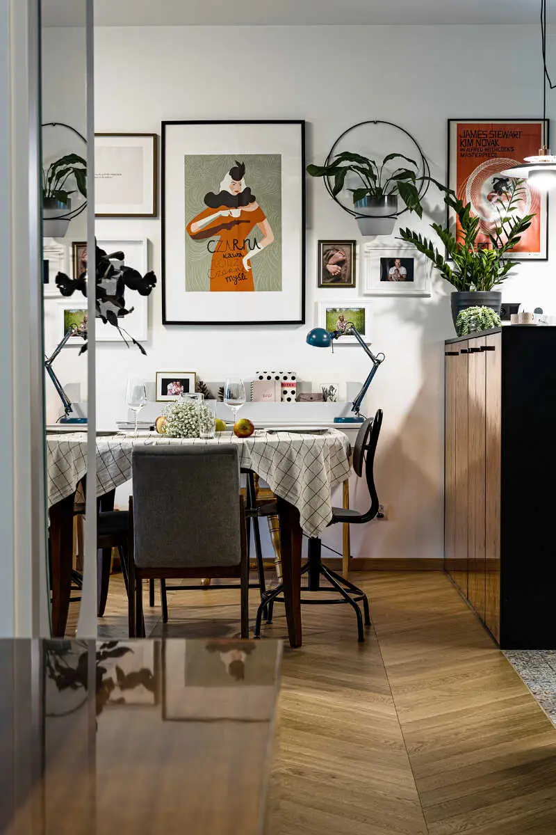 Kuchnia to serce każdego domu. Właściciele zdecydowali się na dużą ilość miejsc do przechowywania w postaci zabudowy na pełną wysokość pomieszczenia. Na szczególną uwagę zasługuje wykończona miedzianą blachą pół-wyspa, która oddziela kuchnię od salonu. Centralnym punktem pomieszczenia jest stary, drewniany stół, stojący na tle ściany z kolekcją plakatów od polskich grafików.