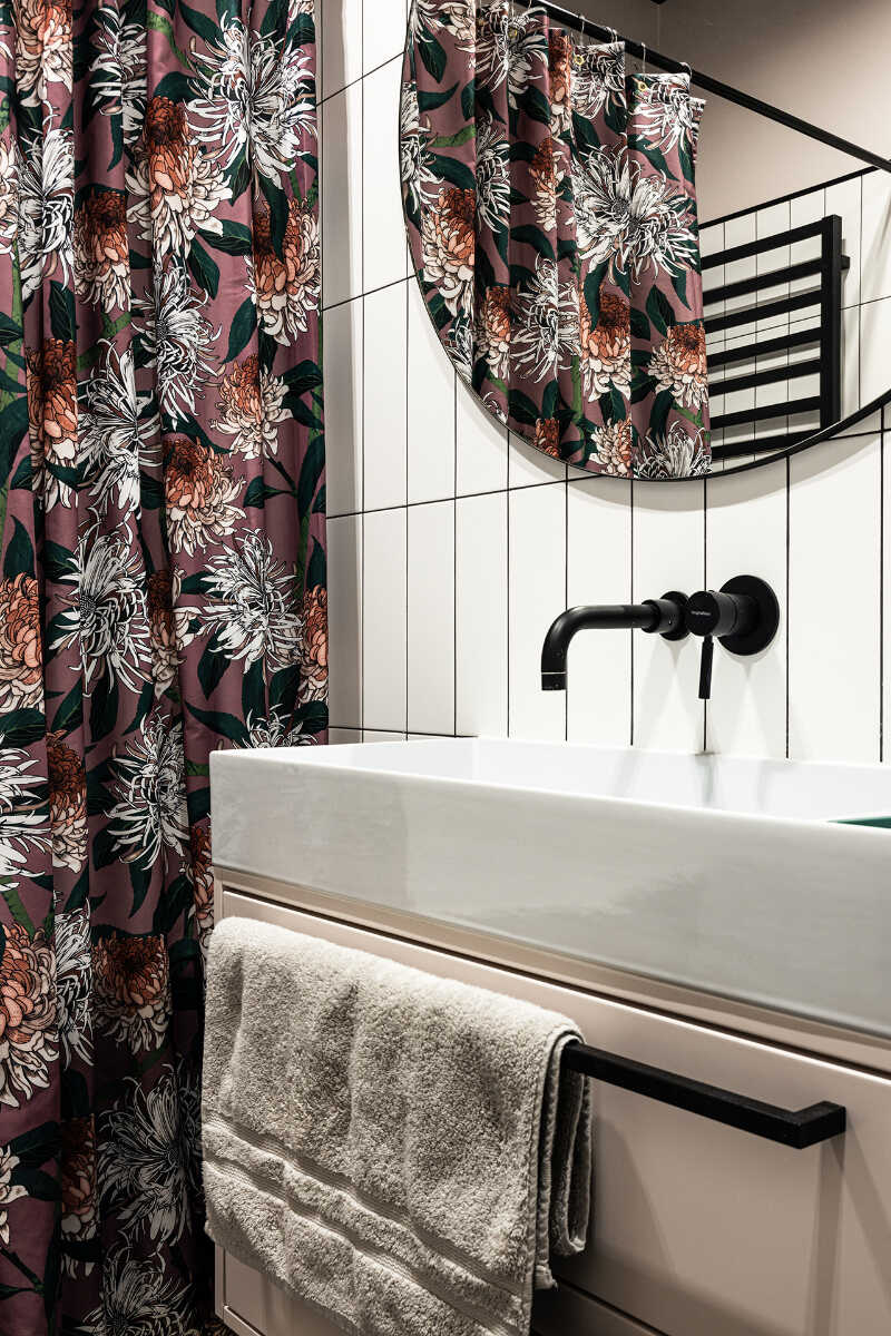 Mieszkając z trzema mężczyznami trzeba nieraz pójść na kompromis. Projektantce udało się przeforsować kobiecą, różową łazienkę, a w zamian zaprojektowała dla swojego męża grafiki z jego ulubionym zespołem piłkarskim, które rozmieściła w różnych częściach ich wspólnego domu.