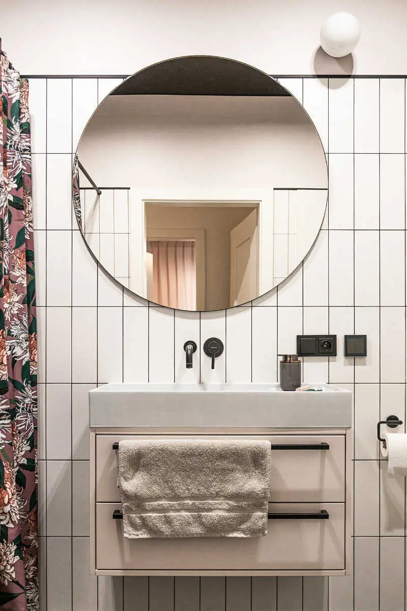Łazienka stanowi doskonały przykład idealnego połączenia kolorów jak pudrowego różu i czerni. Na ścianach ułożono pionowo białe płytki cegiełki, a na podłodze czarne płytki imitujące kamień.