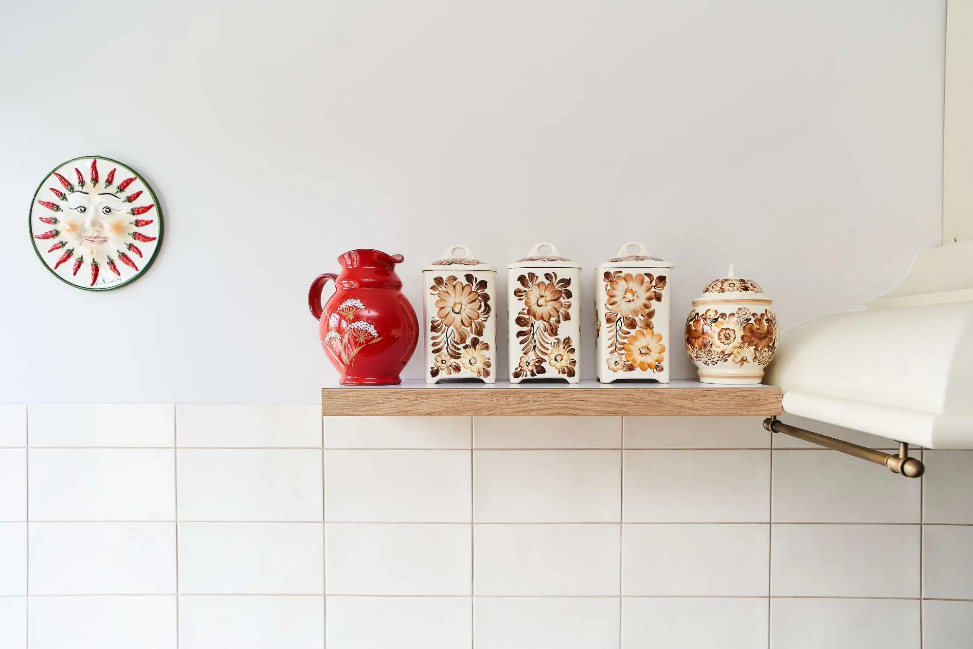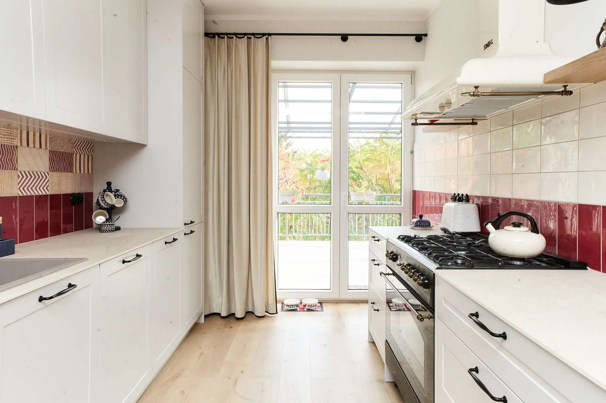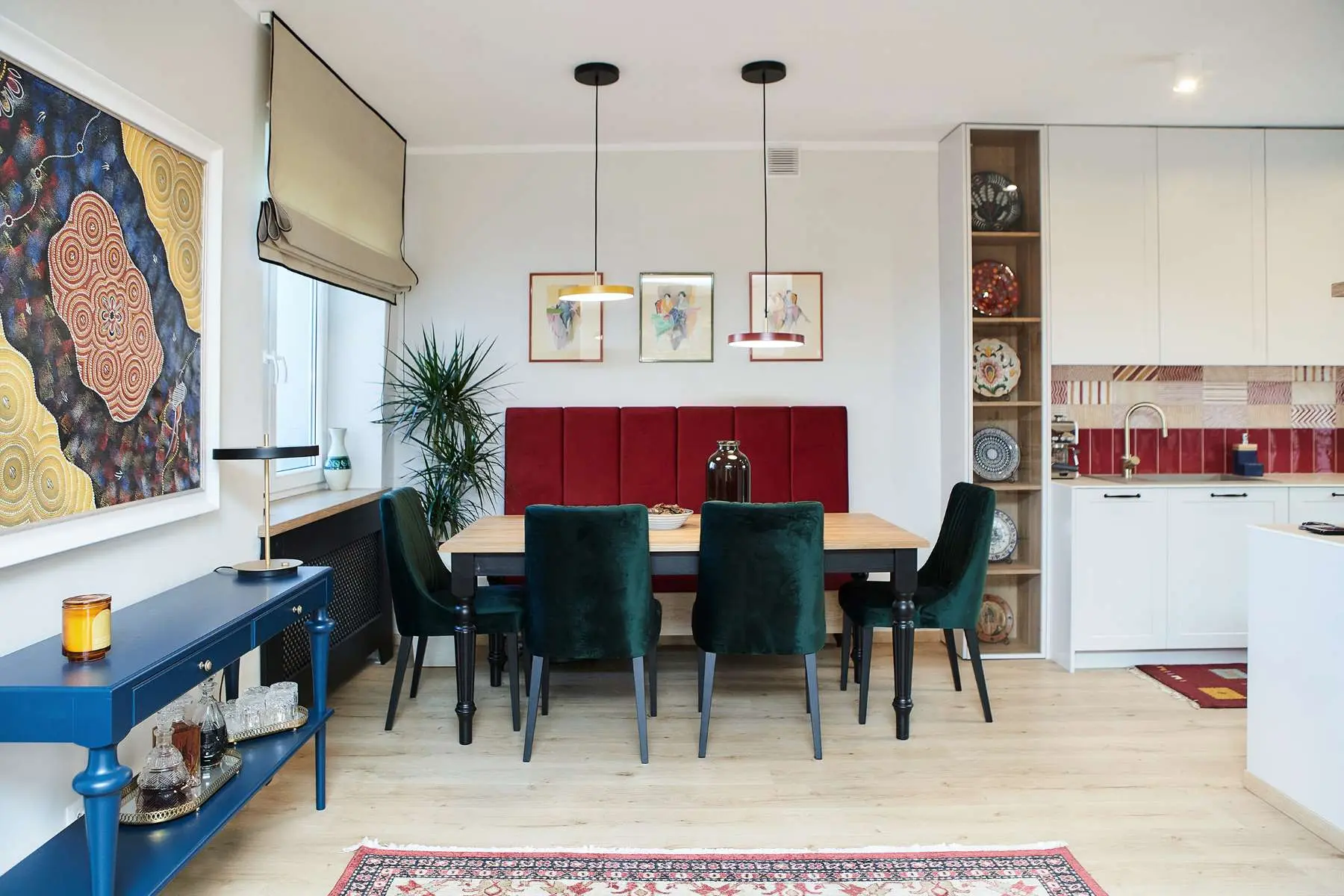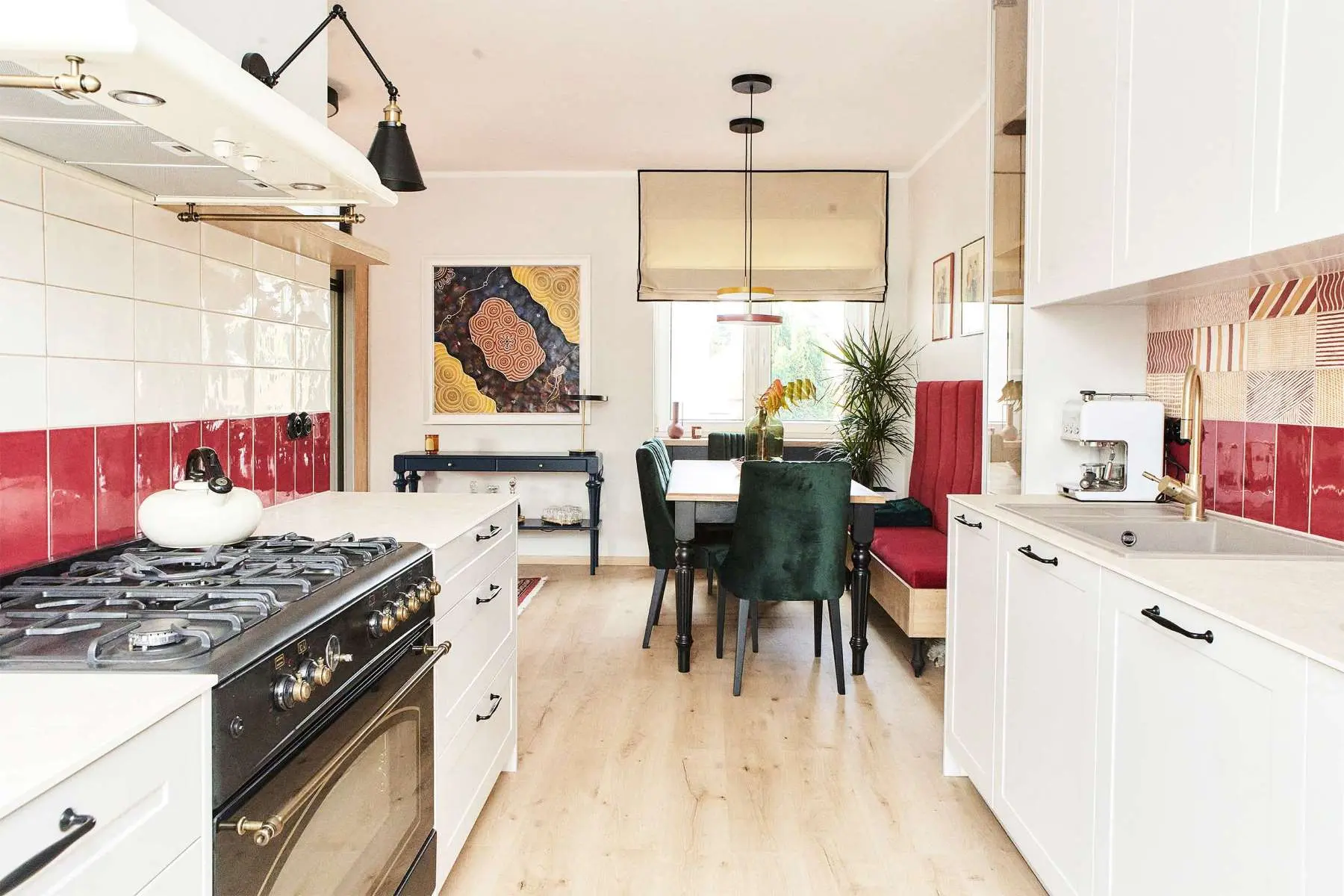 Biała kuchnia, z elementami retro i złotymi akcentami została podkręcona intensywnymi czerwonymi płytkami. Nie ma tu jednak ani kropli przesady, wszystko jest spójne i funkcjonalne. Ten sam czerwony akcent pojawia się również w jadalni w postaci oryginalnego tapicerowanego siedziska.