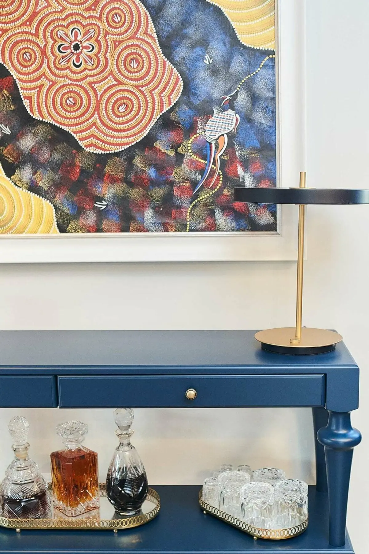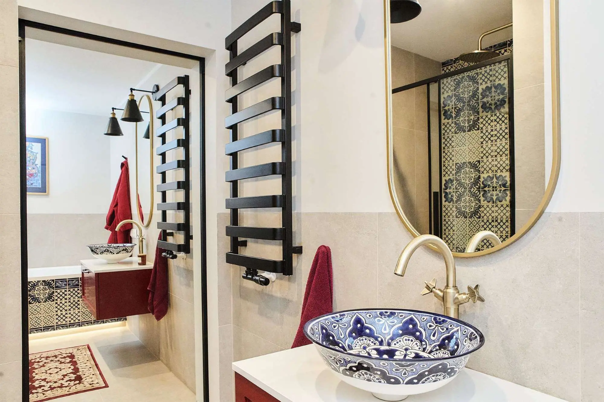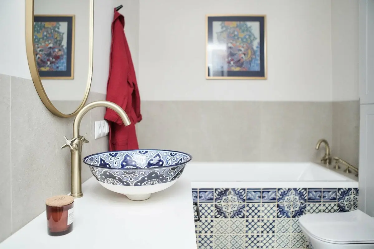 Największą ozdobą łazienki jest oczywiście malowana w stylu meksykańskim umywalka oraz patchworkowe granatowe płytki. Pomimo odważnych wzorów przestrzeń nie przytłacza, jest tu harmonijnie i spójnie z resztą mieszkania. Wnętrza inspirują i zachwycają swoją łagodnością z delikatnym pazurem i ciekawymi smaczkami z dalekiego świata.