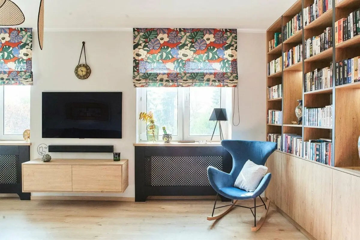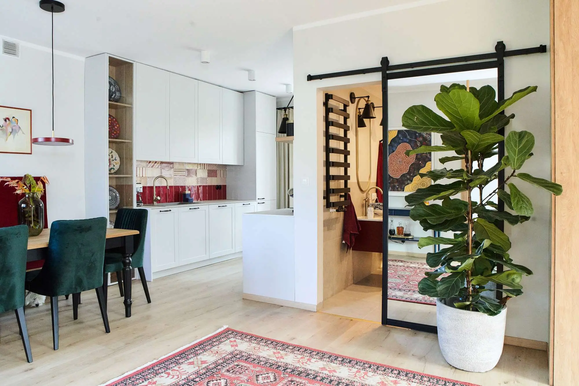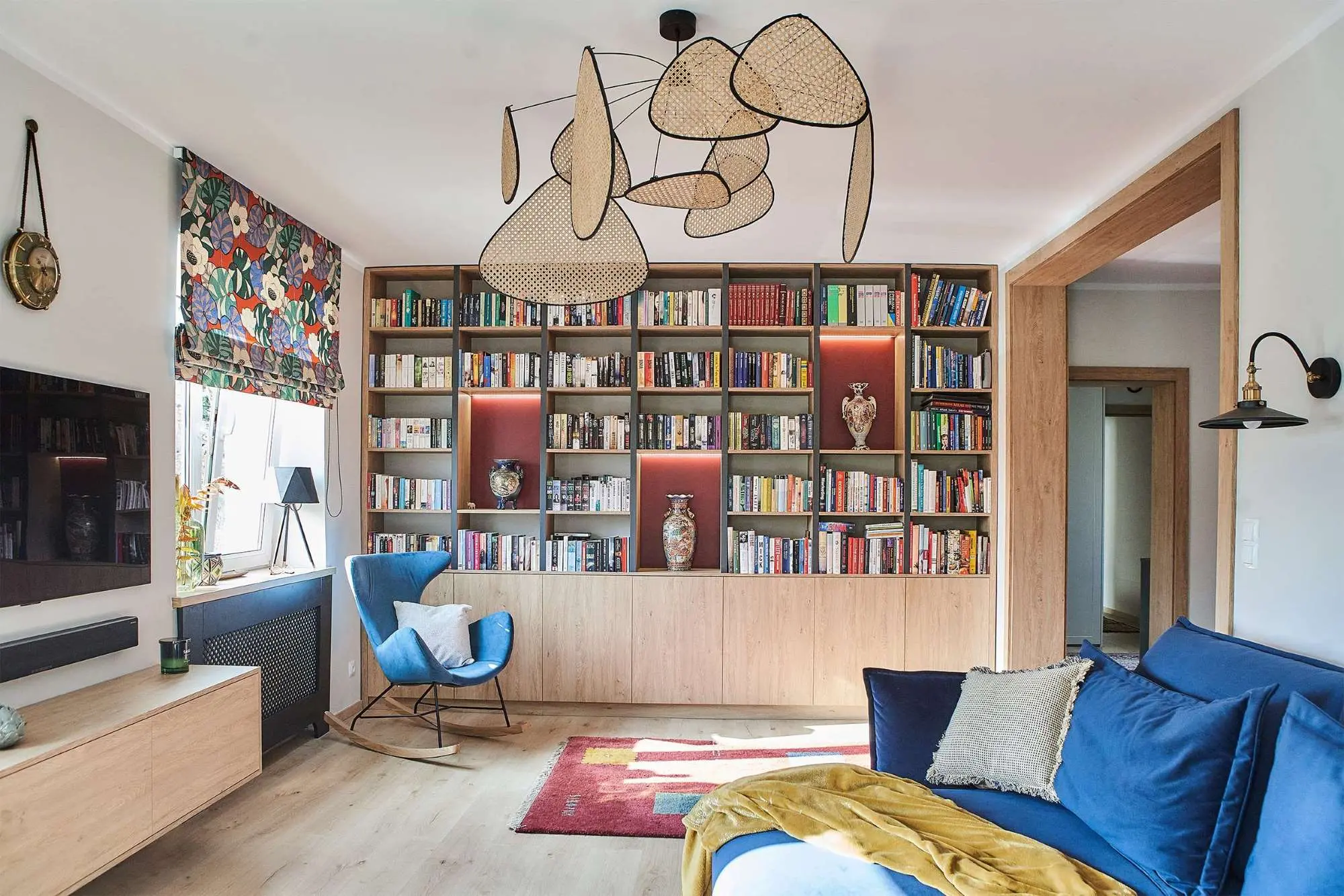 Kolorowy projekt mieszkania 85 metrowego to dzieło architekt Joanny Stefanowskiej z pracowni Oswojone Wnętrze. Założeniem projektu miało być stworzenie dla domowników otwartej, jasnej przestrzeni, która stanie się również tłem dla przywiezionych pamiątek. Właścicielka mieszkania jest miłośniczką dalekich podróży oraz kolekcjonerką obrazów. Dzięki właśnie podróżom nie boi się mocnych i odważnych kolorów, które wpływają na nią pozytywnie i energetyzująco.