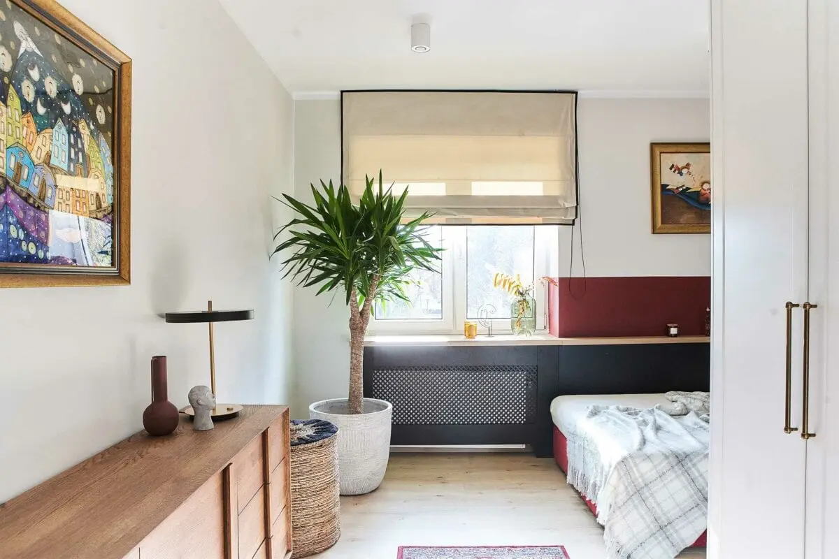 W sypialni również odnajdziemy akcent energetycznej czerwieni. Odważny i stylowy zabieg, podkreślający wyjątkowość aranżacji to czerwone łóżko z tapicerowanym, pikowanym zagłówkiem oraz lamperia, która wraca do łask w odmienionym stylu. Ściany zdobią obrazy przywiezione z podróży.