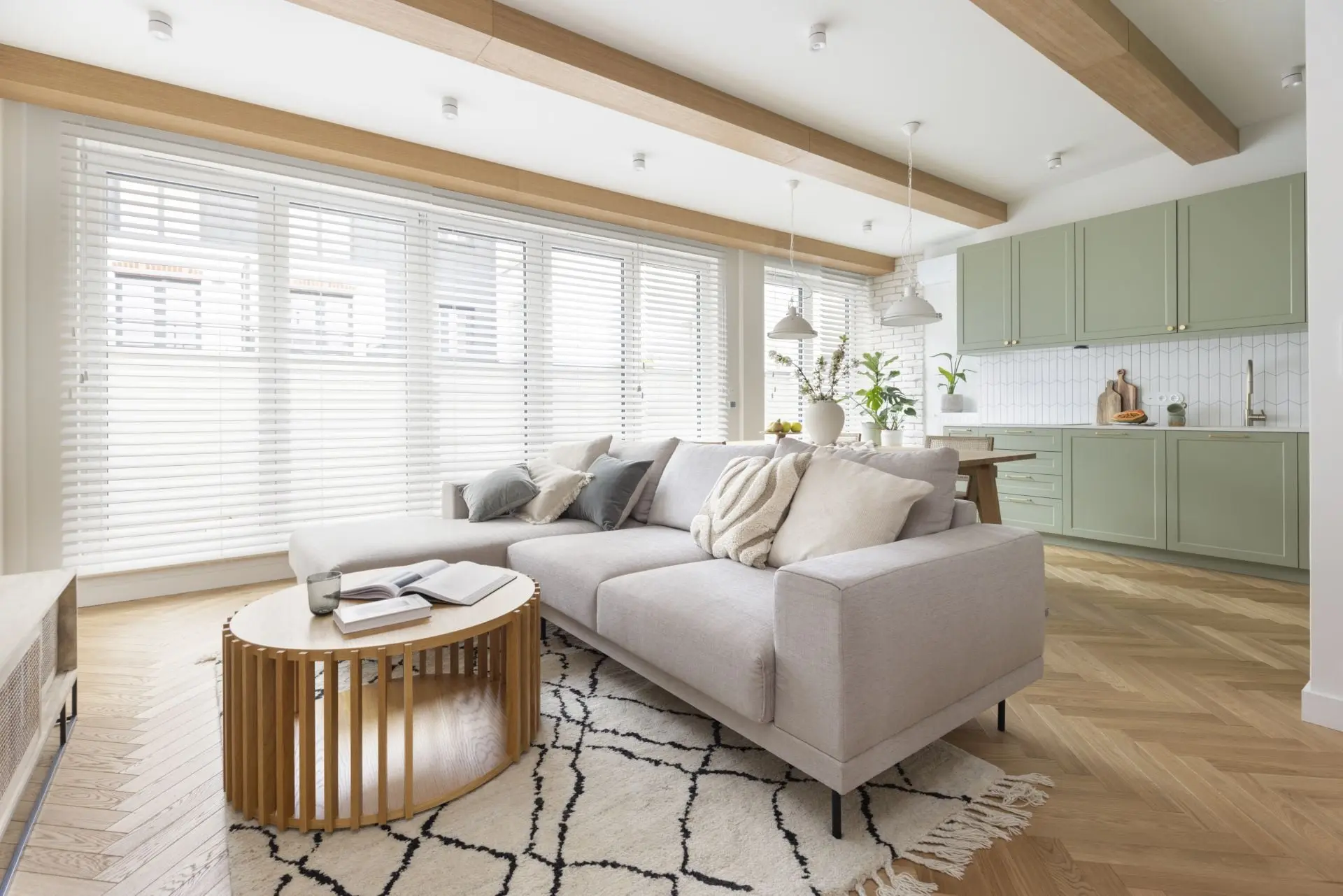 Z kuchni przenosimy się do salonu, w którym uwagę zwraca na siebie duża i wygodna sofa. Miłośniczka podróży często zaprasza do siebie znajomych, dlatego taki mebel to świetne rozwiązanie sprzyjające wspólnej, wieczornej integracji. Podłoga od Jawor Parkiet ułożona w klasyczną jodełkę wraz z kremowym dywanem nadają pomieszczeniu klasycznego i eleganckiego szyku. Liczne seanse filmowe oraz pokaz zdjęć z egzotycznych wypraw, będą możliwe dzięki telewizorowi Samsung The Frame, będącemu centralnym punktem pomieszczenia.