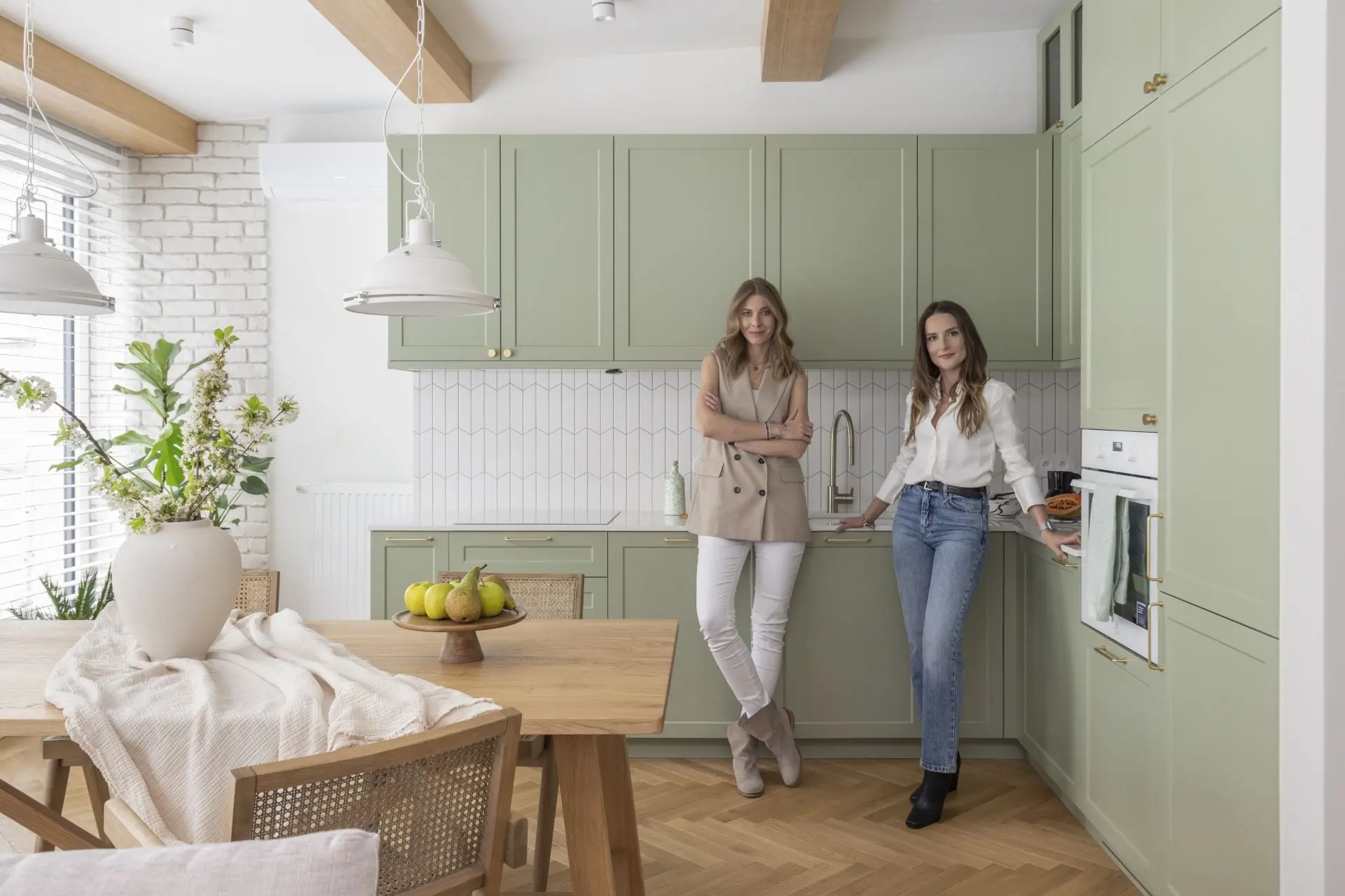 Na tle delikatnej i stonowanej bazy mieszkania, uwagę zwraca kuchnia w zgaszonej, oliwkowej tonacji. ,,Właścicielce bardzo zależało na zielonej kuchni. Wybór odpowiedniej barwy stanowił jednak wyzwanie. Pewnego dnia przyniosła do naszej pracowni zebrane przez siebie liście, które stały się inspiracją do dominującego w mieszkaniu odcienia” – zdradzają Ada Skwira i Małgorzata Liebhart z WZ Studio.