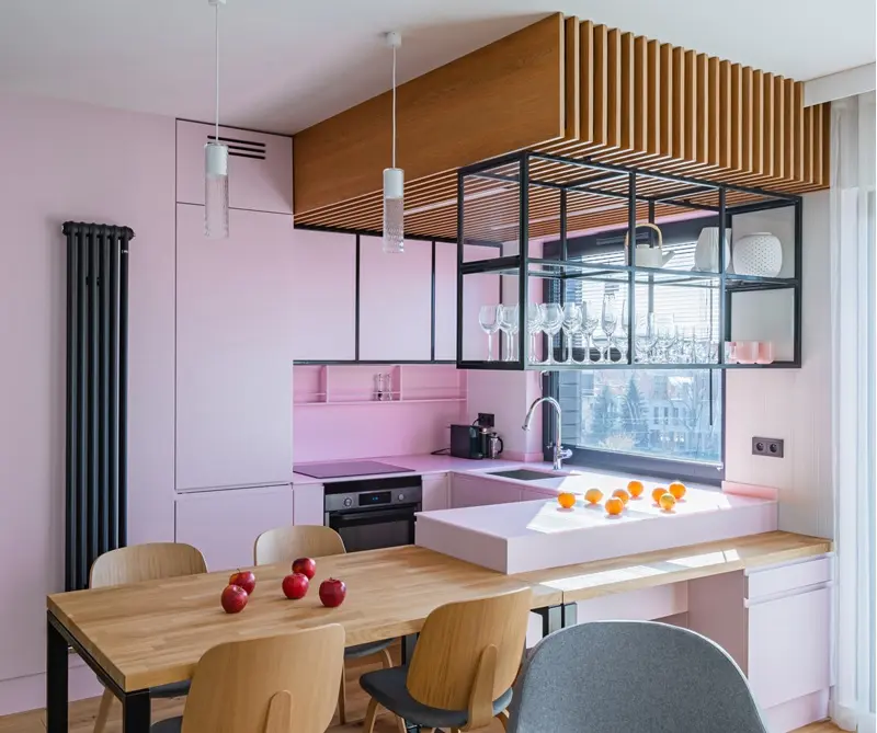 RealizacjeNiby delikatne, a jednak z pazurem – mieszkanie z różową kuchnią | Proj: Piotr Kosydar