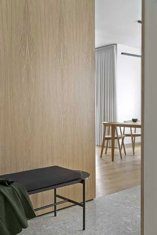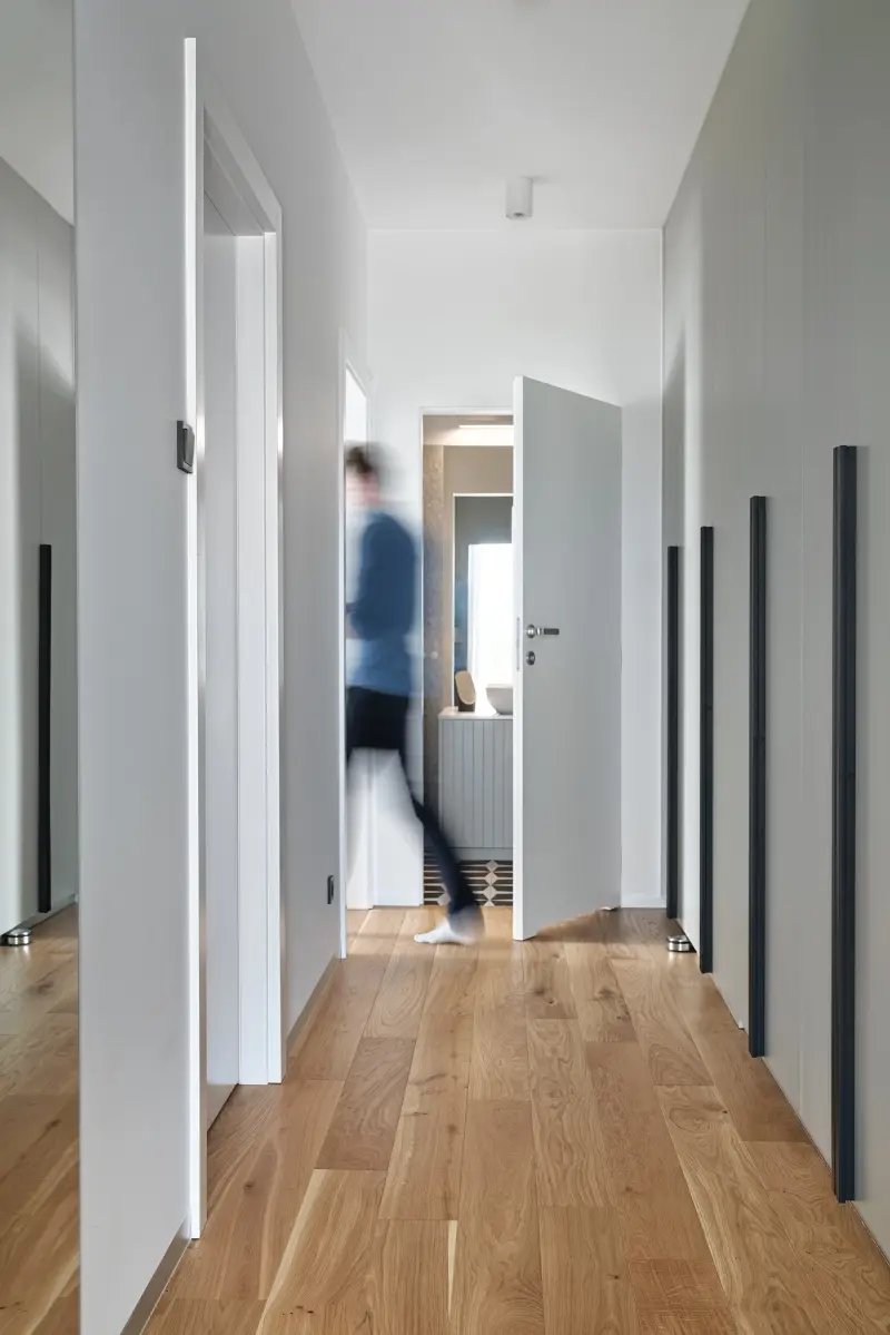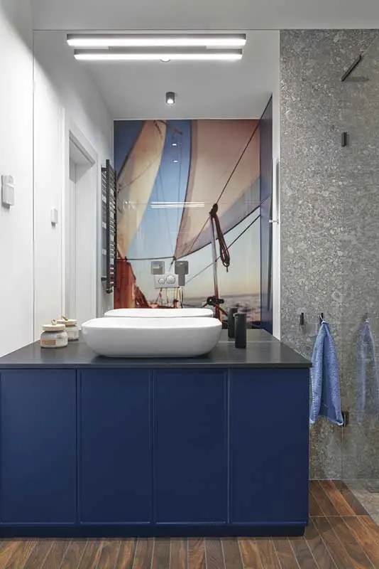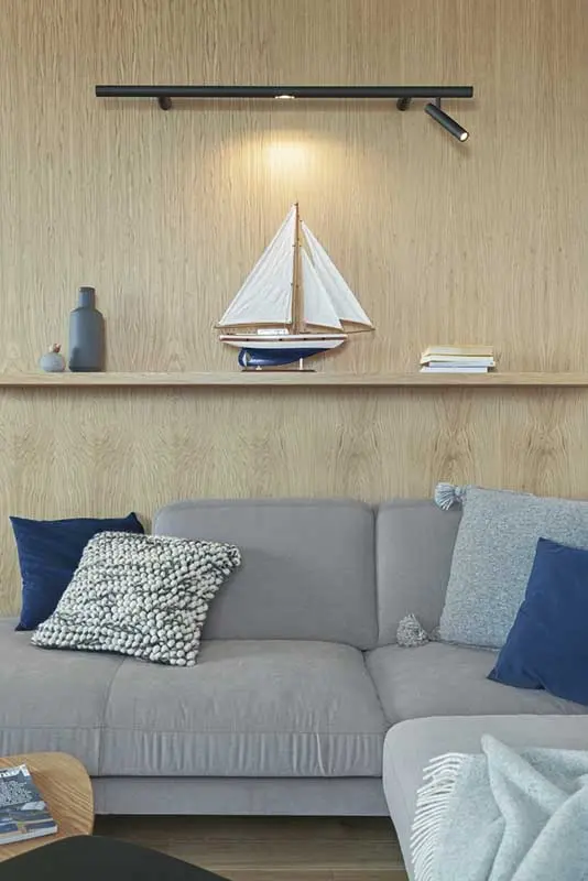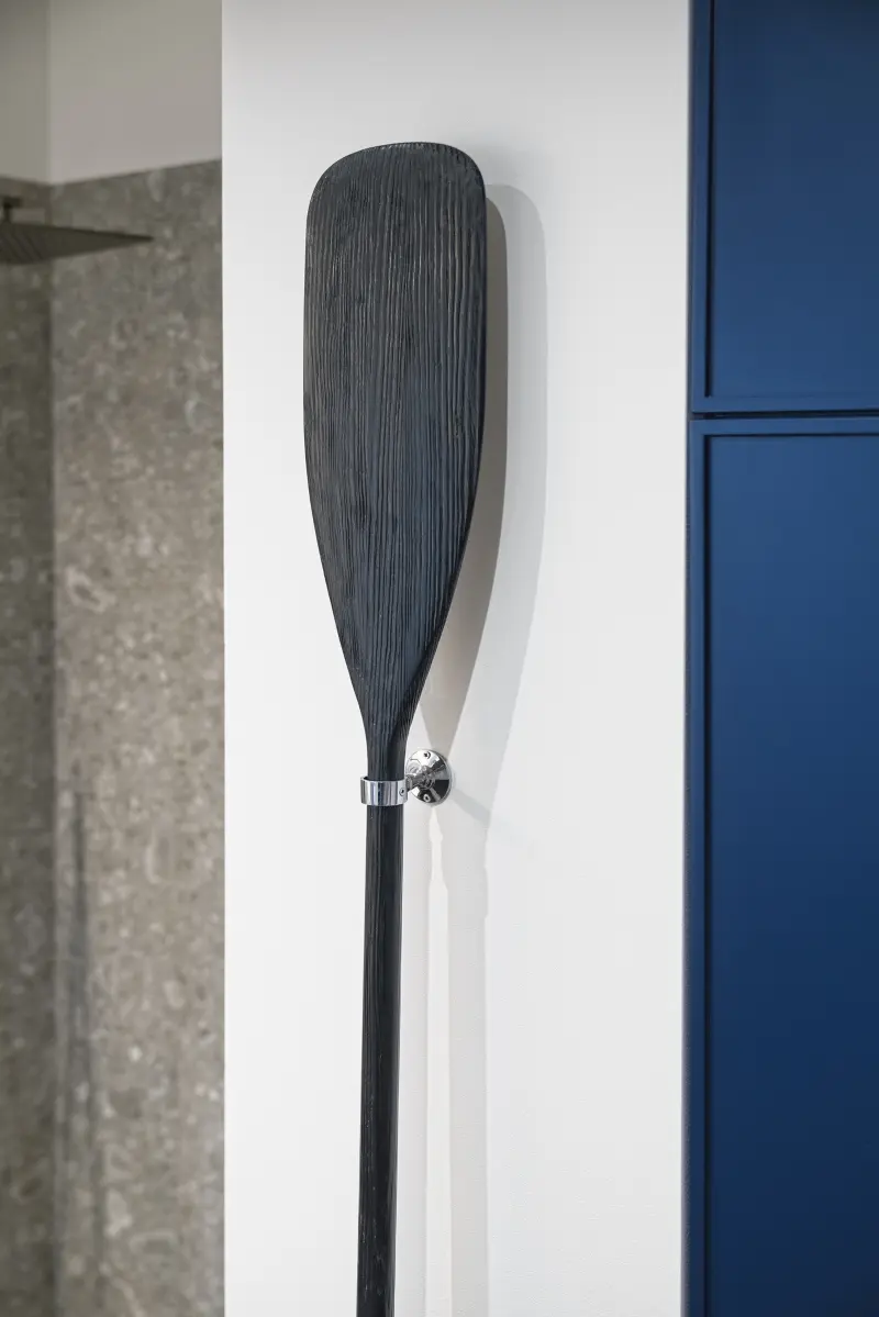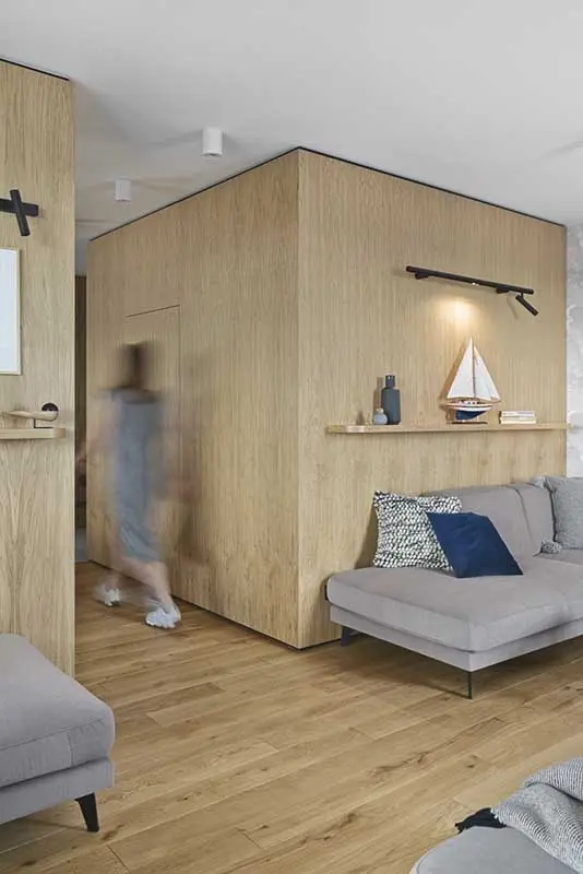 Przez całość projektu przemawia statyka. Nie ma tu rzeczy zbędnych. Surowa selekcja wyposażenia, ograniczona jest do funkcjonalnego minimum. W dodatkach projektantka postawiła na tekstylia o zróżnicowanej fakturze oraz subtelne bibeloty związane z żeglarstwem. Natomiast naturalność materiałów i odpowiednie proporcje ich użycia, składa się na doskonałe tło dla rodzinnego życia. Dzięki eleganckiemu minimalizmowi z dużą ilością drewna, skąpanemu w spokojnym spektrum błękitów, w mieszkaniu panuje przytulna atmosfera. Jednocześnie aranżacja stanowi przykład ponadczasowego wnętrza, które będzie służyć właścicielom przez długie lata.