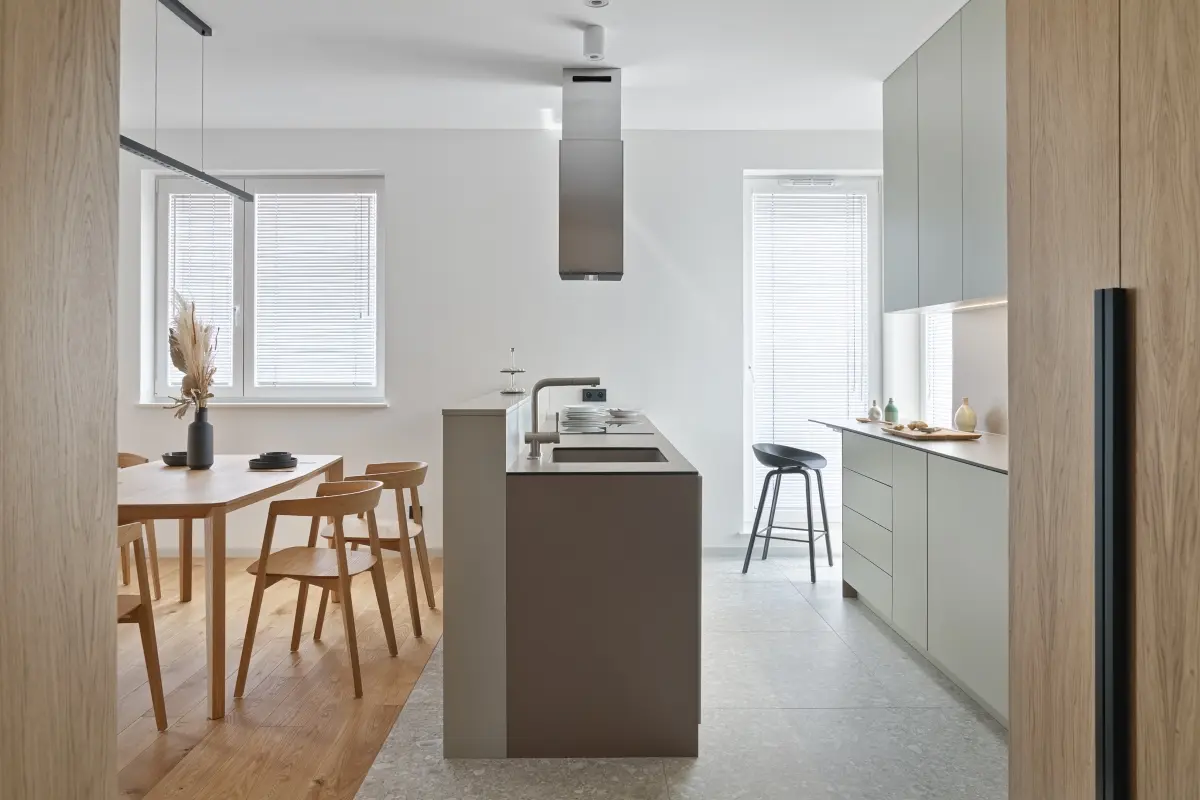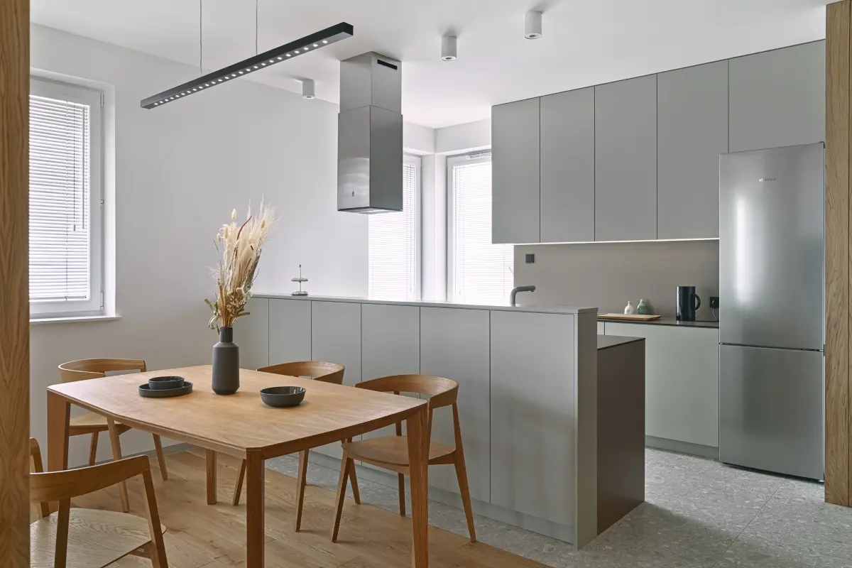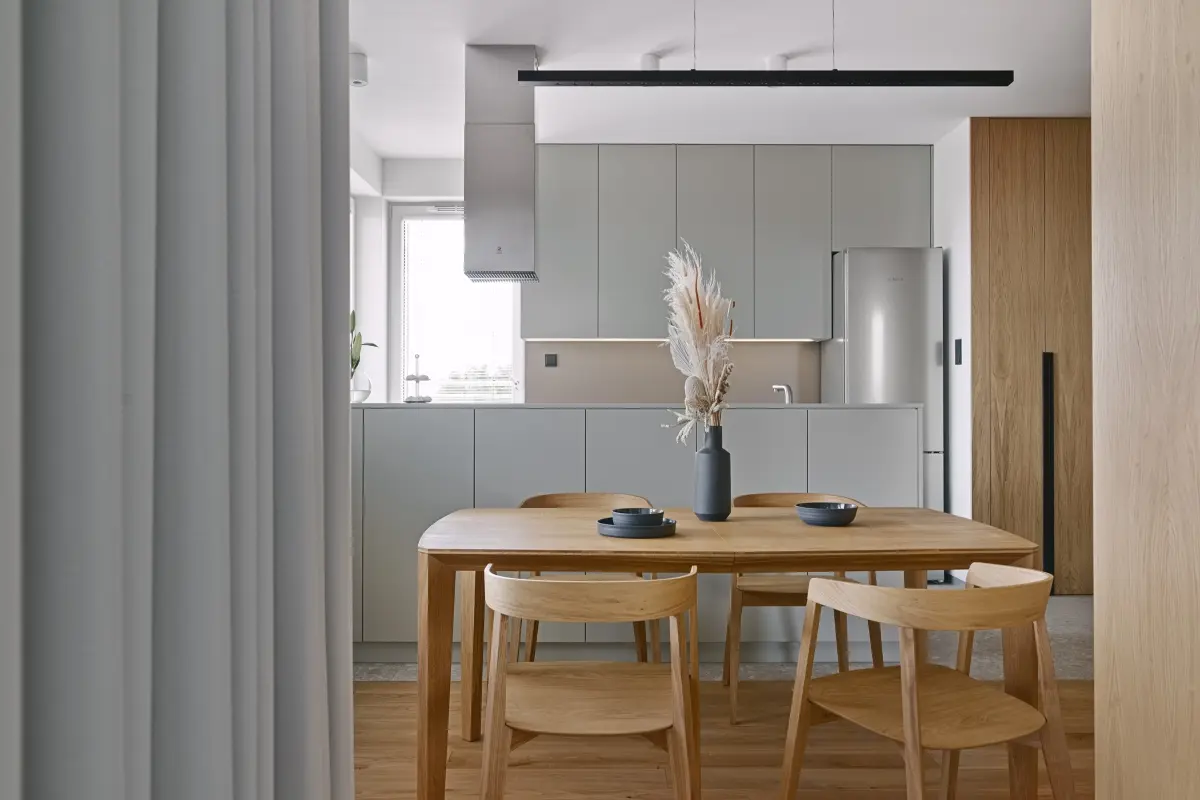 Sercem 100-metrowego apartamentu jest strefa dzienna. Aneks kuchenny subtelnie wyznacza pokrycie podłogowe w formie płytek o teksturze lastryko. Od strony jadalni kuchnię oddziela wyspa. Postawiono tutaj na proste lakierowane fronty w nieoczywistym, szaroniebieskim odcieniu. Natomiast w słonecznym narożniku zorganizowano miejsce na poranną kawę. Część salonu z jadalnią wypełnia drewno dębowe. Projektantka chciała, by mieszkańcy mieli z nim bezpośrednią styczność, dlatego występuje ono na podłodze oraz ścianach, gdzie zastosowano naturalny fornir. Stanął tutaj również solidny stół z krzesłami, który pięknie podkreśla funkcje jadalni. Główna sypialnia powtarza schemat materiałowy i kolorystyczny części dziennej. Classic Blue pojawił się w dodatkach i stanowi mocny akcent barwny. Łazienki mieszkania dopracowane są w każdym detalu. Obie zachowują neutralną i stonowaną gamę kolorystyczną. W jednej z nich zaakcentowano pasję lokatorów do pobliskich mazurskich jezior. Stąd wprowadzenie marynistycznych akcentów takich jak wiosło na ścianie czy nadruk na szkle nawiązujący do fregaty.