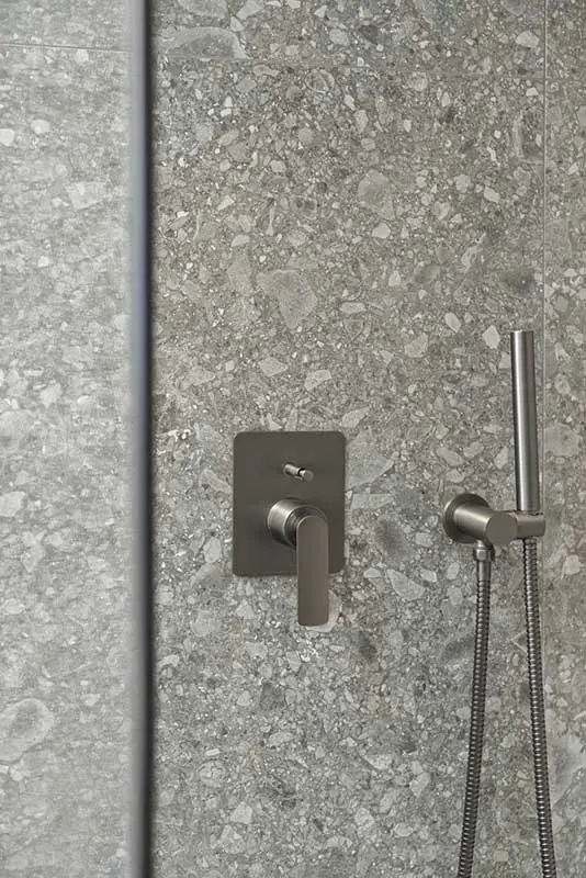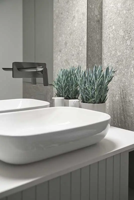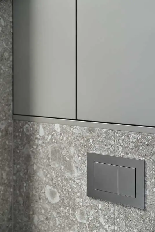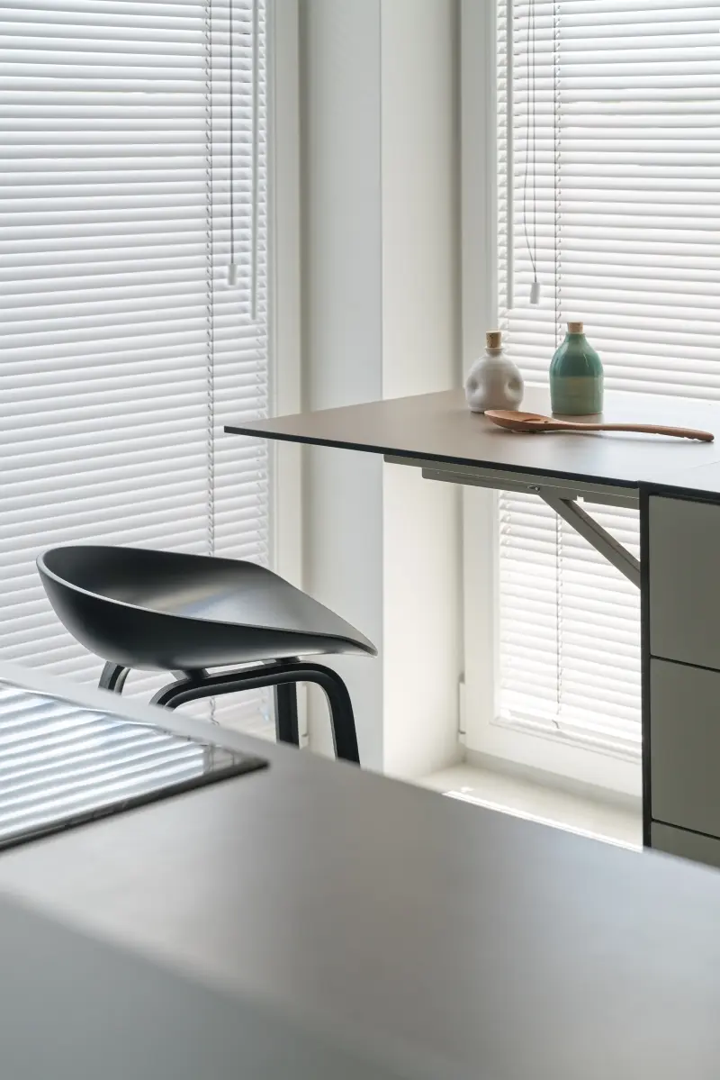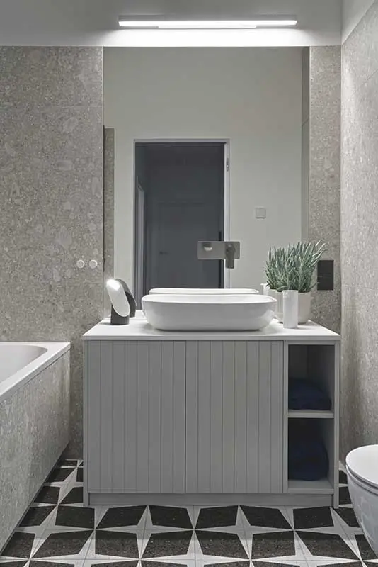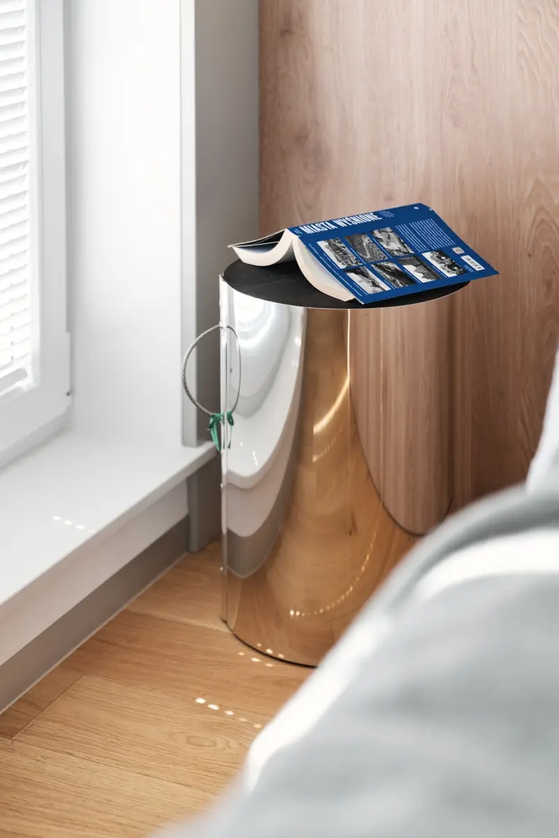 Sercem 100-metrowego apartamentu jest strefa dzienna. Aneks kuchenny subtelnie wyznacza pokrycie podłogowe w formie płytek o teksturze lastryko. Od strony jadalni kuchnię oddziela wyspa. Postawiono tutaj na proste lakierowane fronty w nieoczywistym, szaroniebieskim odcieniu. Natomiast w słonecznym narożniku zorganizowano miejsce na poranną kawę. Część salonu z jadalnią wypełnia drewno dębowe. Projektantka chciała, by mieszkańcy mieli z nim bezpośrednią styczność, dlatego występuje ono na podłodze oraz ścianach, gdzie zastosowano naturalny fornir. Stanął tutaj również solidny stół z krzesłami, który pięknie podkreśla funkcje jadalni. Główna sypialnia powtarza schemat materiałowy i kolorystyczny części dziennej. Classic Blue pojawił się w dodatkach i stanowi mocny akcent barwny. Łazienki mieszkania dopracowane są w każdym detalu. Obie zachowują neutralną i stonowaną gamę kolorystyczną. W jednej z nich zaakcentowano pasję lokatorów do pobliskich mazurskich jezior. Stąd wprowadzenie marynistycznych akcentów takich jak wiosło na ścianie czy nadruk na szkle nawiązujący do fregaty.