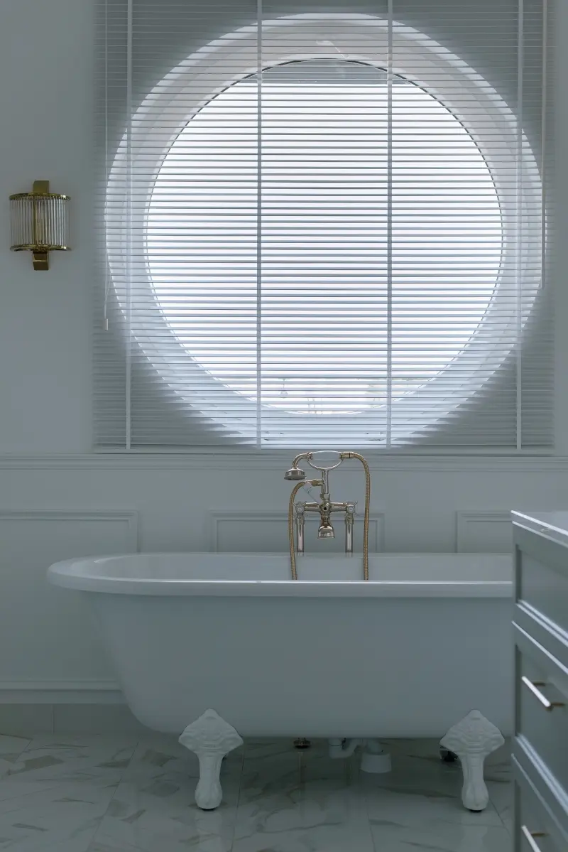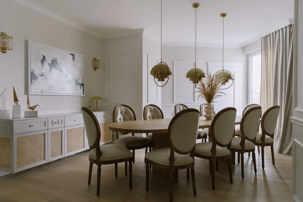 Wnętrza inspirowane stylistyką hampton niosą za sobą niebezpieczeństwo przesadnej ozdobności i ciężkości. Wykorzystanie jasnych barw pozwoliło uniknąć tego niepożądanego efektu. Architektki postanowiły jeszcze dodatkowo przełamać aranżację nowoczesnymi akcentami. Stąd między innymi wybór kultowych lamp Tolomeo od Artemide czy Multi-Lite marki Gubi. Mamy tutaj też sporo dekoracji o współczesnym sznycie. Poza abstrakcyjnym malarstwem, figurki nawiązujące do origami, a także minimalistyczne rzeźby i ceramikę. Kropką nad i w aranżacji wnętrza było wprowadzenie złotych akcentów, które przewijają się w całym mieszkaniu. Materiał ten wybrano do uchwytów meblowych, oświetlenia, dekoracji, a także armatury kuchennej i łazienkowej.