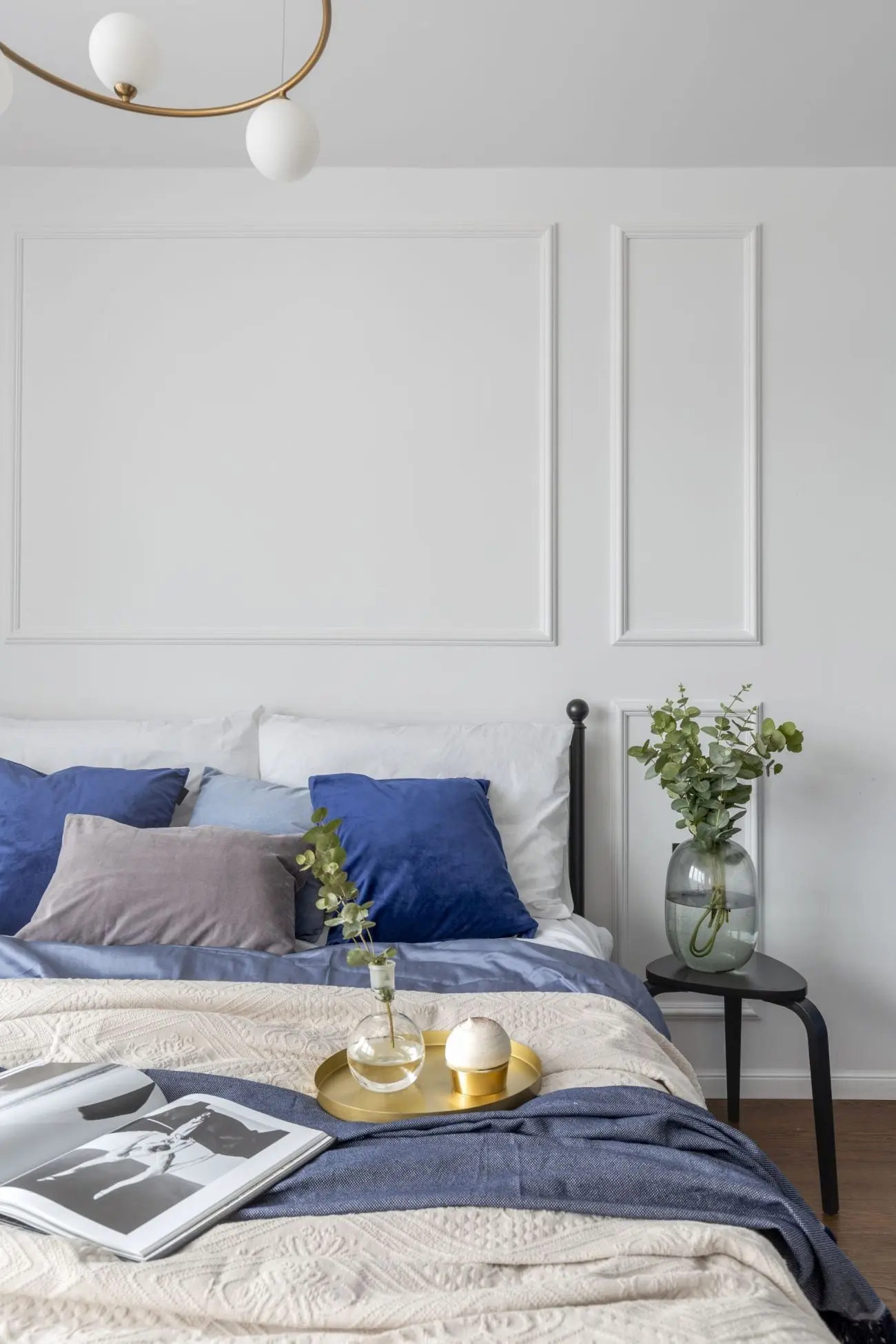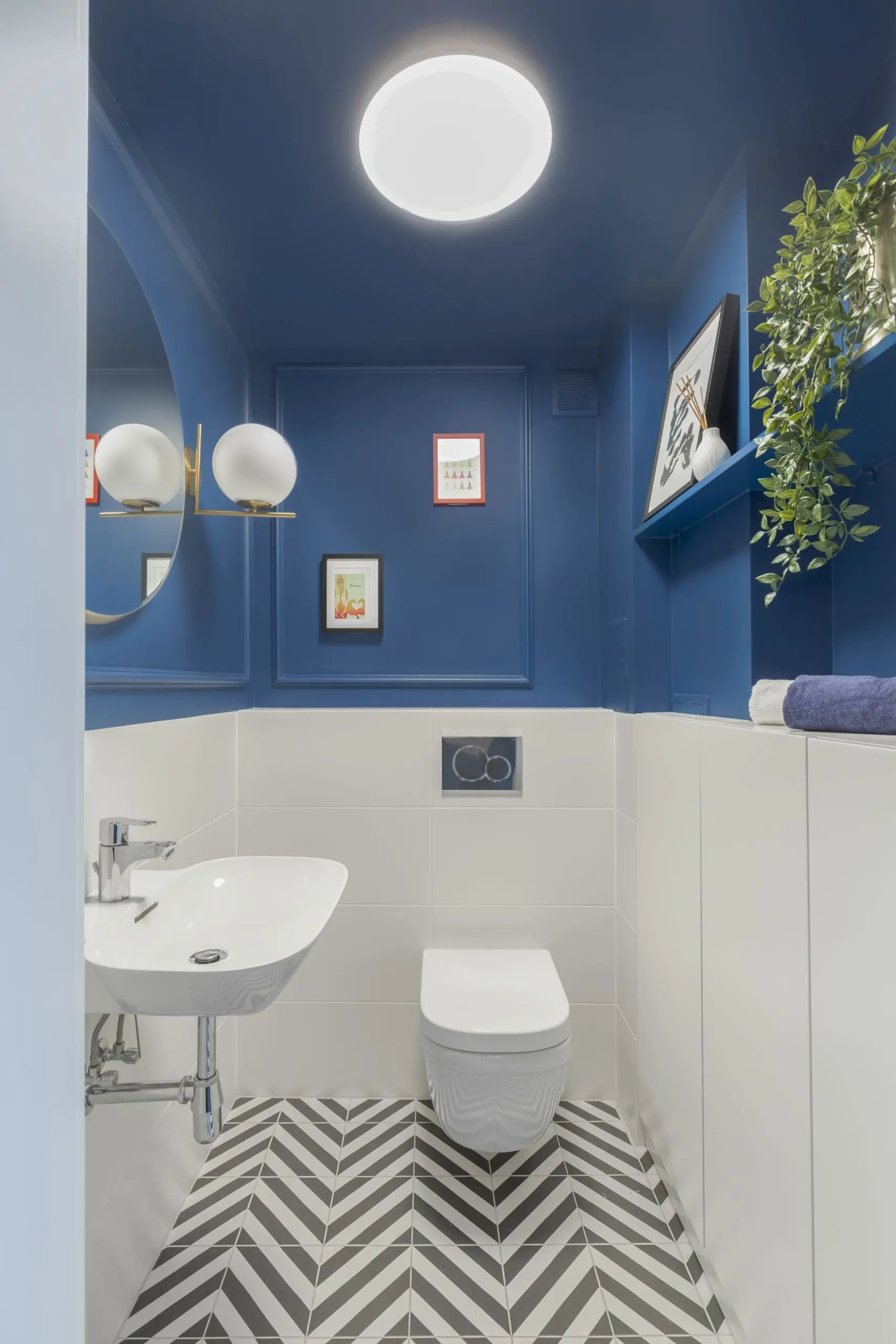 Toaleta jest nowoczesna i dobrze zorganizowana. Po prawej stronie umieszczono dyskretną zabudowę, w której powstała strefa przechowywania. Ściany i sufit pokryto niebieską farbą, nawiązując do pozostałej części mieszkania. Dodatkową ozdobę stanowią sztukaterie oraz dekoracyjne akcenty w postaci złotych lamp.