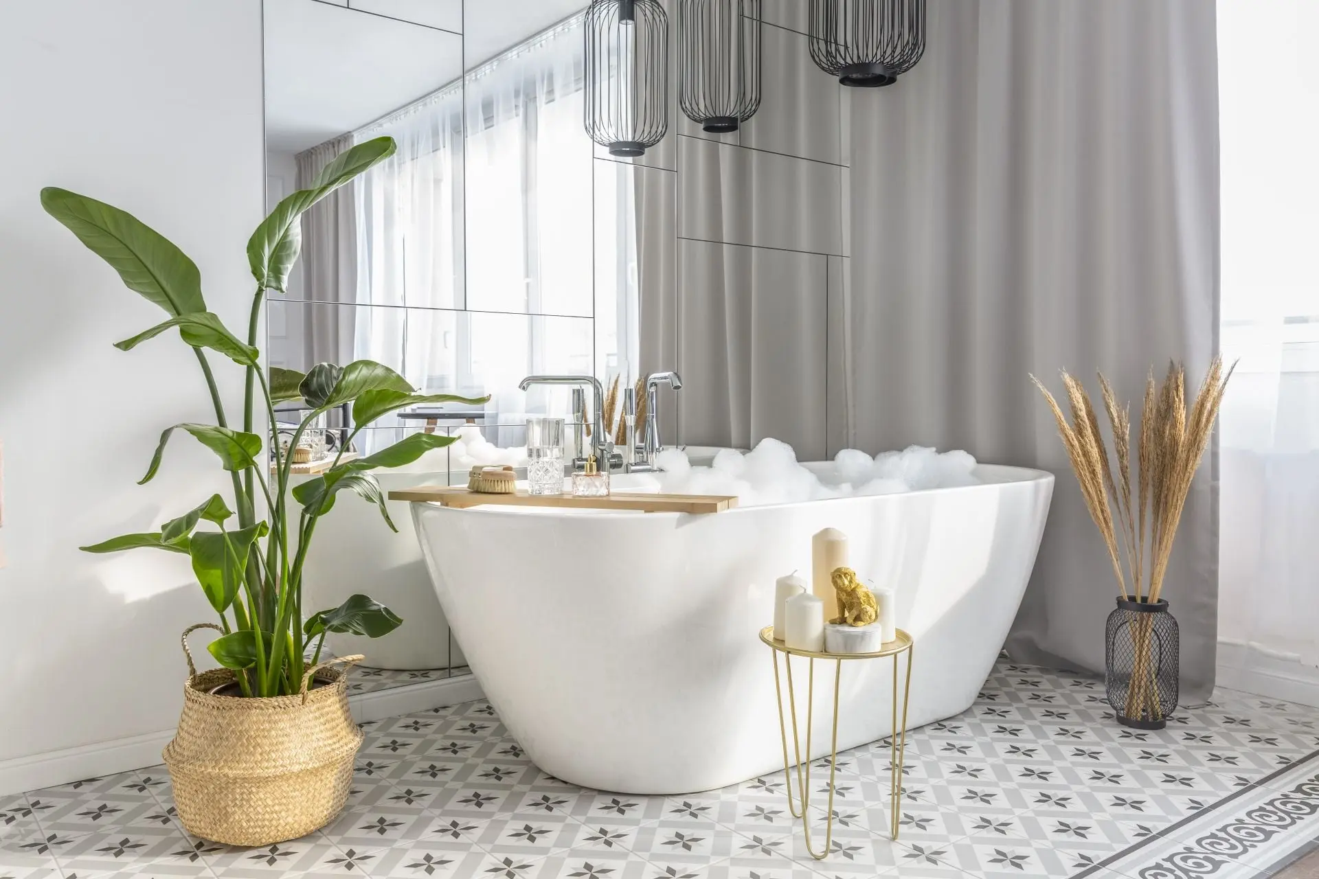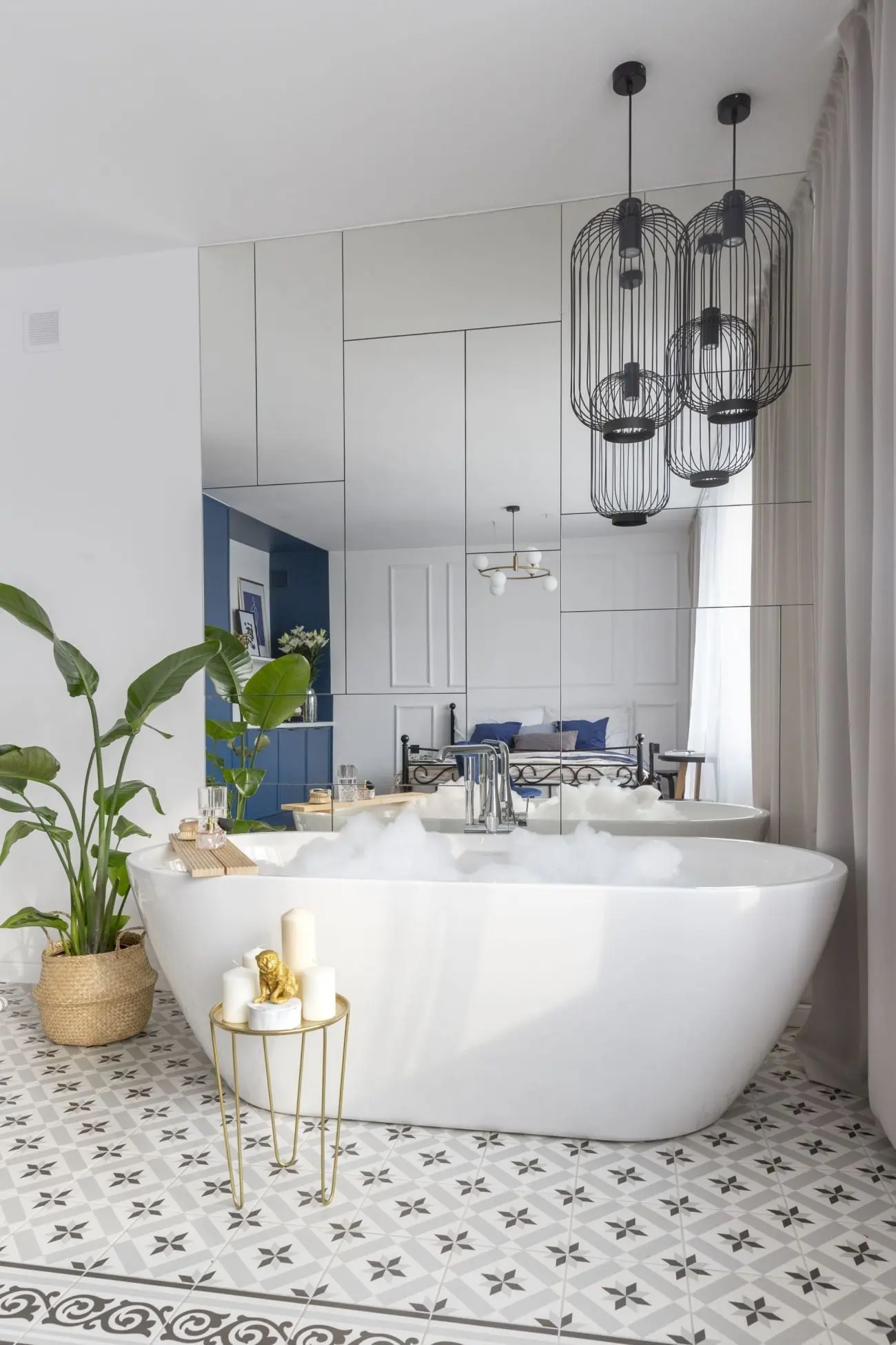 Przestrzeń pełni wiele funkcji – łączy w sobie kuchnię, jadalnię, sypialnię oraz… pokoju kąpielowego. Naprzeciwko szerokiego łóżka z dekoracyjną ramą została umieszczona duża wolnostojąca wanna. Ścianę za nią zdobi kompozycja z luster, która optycznie powiększa pomieszczenie. Granicę tego „salonu kąpielowego” wyznaczają ozdobne płytki. Pośrodku pomieszczenia, pod oknem znalazło się miejsce na stolik wraz z jadalnianymi krzesłami. W aneksie kuchennym zastosowano nowoczesną, minimalistyczną zabudowę, która pozwala w pełni wykorzystać potencjał przestrzeni.