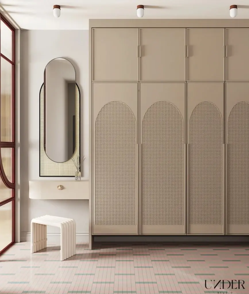 Przebywając we wnętrzu trudno znaleźć kąt, który nie byłby interesujący. Już od samego wejścia wita nas intrygujący przedpokój. Na podłodze znajdują się kolorowe płytki w zielono-różowym kolorze, szafy o fikuśnych drzwiach z plecionką wiedeńską, na suficie punktowe oświetlenie, a wszystko zwieńczone przeszklonymi drzwiami w bordowej, stylizowanej ramie. Znaczącym punktem aranżacji są powtarzalne w każdym pomieszczeniu łuki i zaokrąglenia.