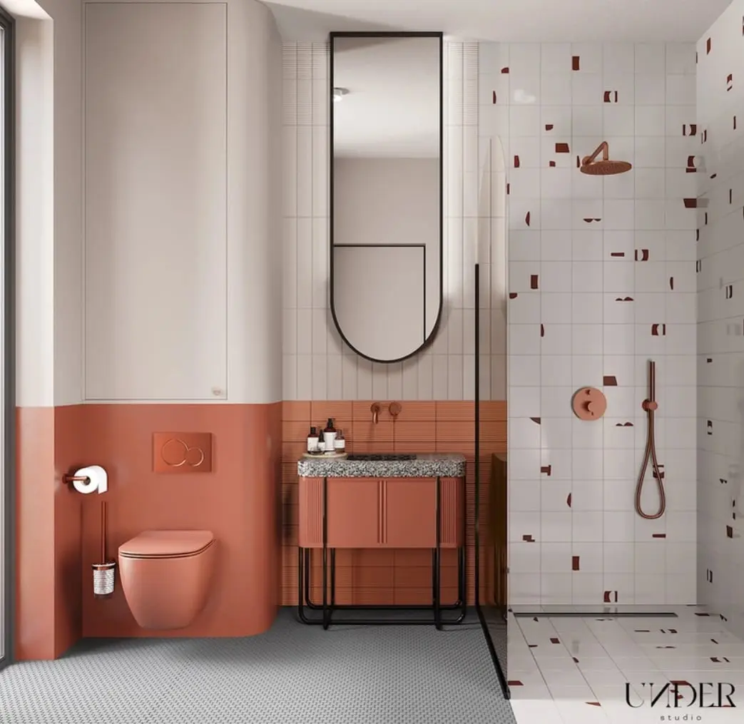 W domu znajdują dwie łazienki. W pierwszej użyto minimalistycznych graficznych płytek 41zero42 Pack, które architekt zestawiła z armaturą w kolorze różowego złota oraz ceramiką w kolorze terakoty.