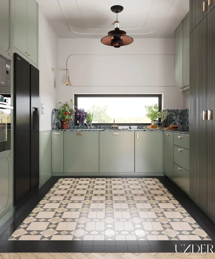 Zielono-oliwkowe szafki znakomicie współgrają z mozaiką na podłodze oraz czarno-miedzianą lampą zwieszaną. W kuchni również występują zaokrąglenia na szafkach, suficie oraz na ścianie przy oknie. Złote elementy dekoracyjne dodają elegancji i wyrafinowania. Wnętrze jest niezwykle oryginalne i nietuzinkowe.