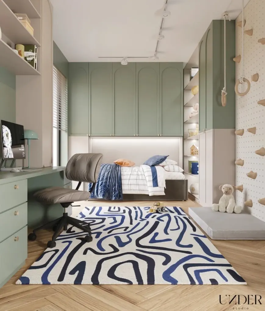 Drugi pokój chłopięcy nawiązuje kolorystyką oraz stylistyką do pokoju młodszego brata.